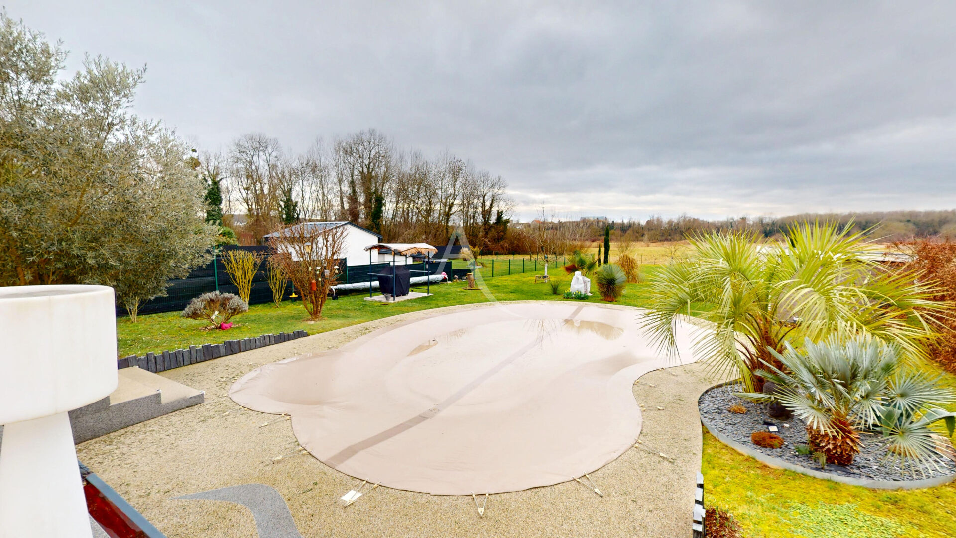 Terrain plat et arboré avec soins de 1 300 m² avec piscine chauffée Waterair (10,3 x 6,5 m) et terrasse, parfait pour profiter de la nature et recevoir.