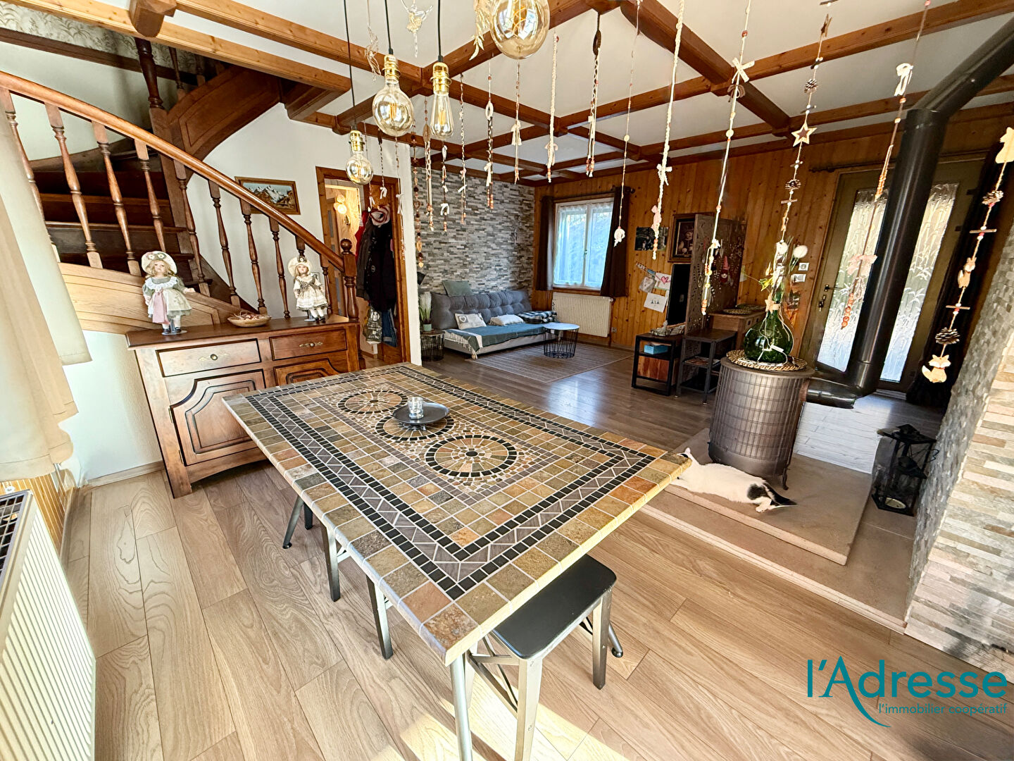 Un salon-séjour spacieux, sublimé par un poêle à bois pour des soirées chaleureuses