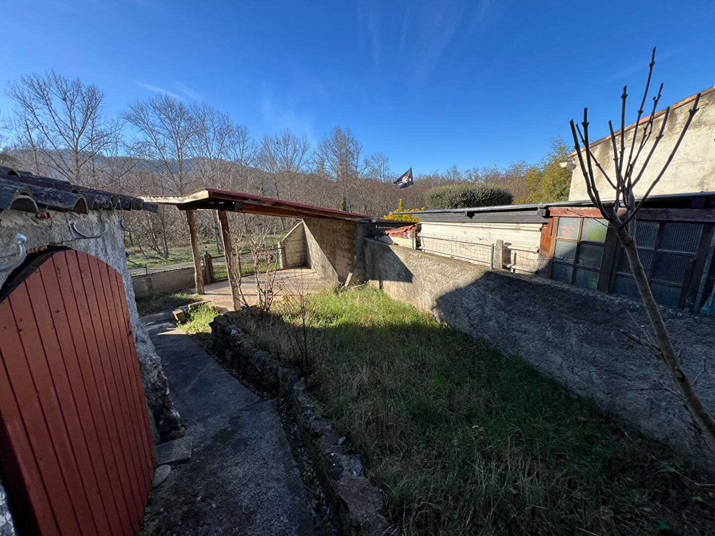 Cette maison comprend une cuisine, un grand séjour, une chambre, salle d'eau WC, buanderie. En contrebas, un abris voiture de bonne taille pour stationner un grand véhicule.