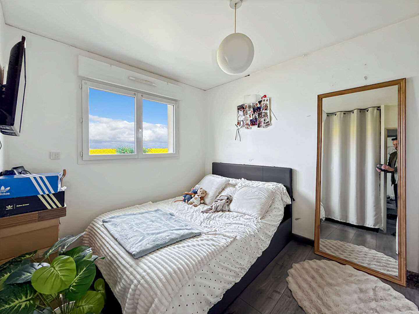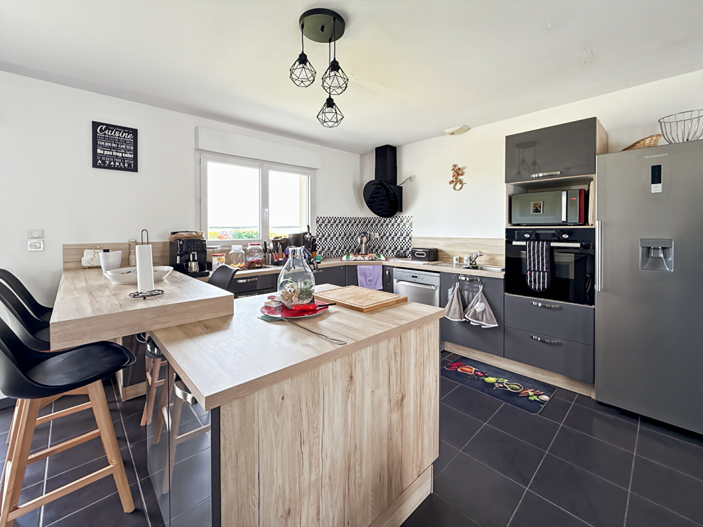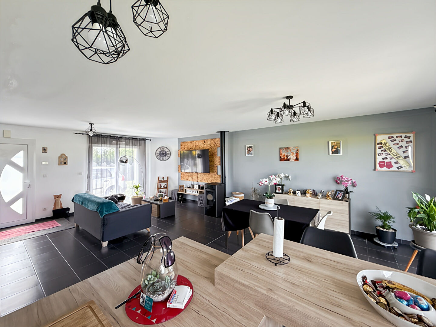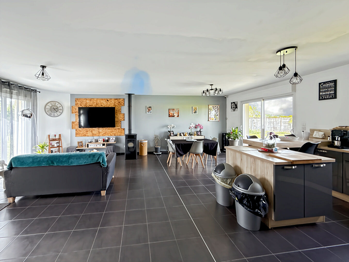 Maison de plain pied de 2017 comprenant : salon-séjour avec poêle à granulés, cuisine ouverte, 3 chambres, salle de bains.