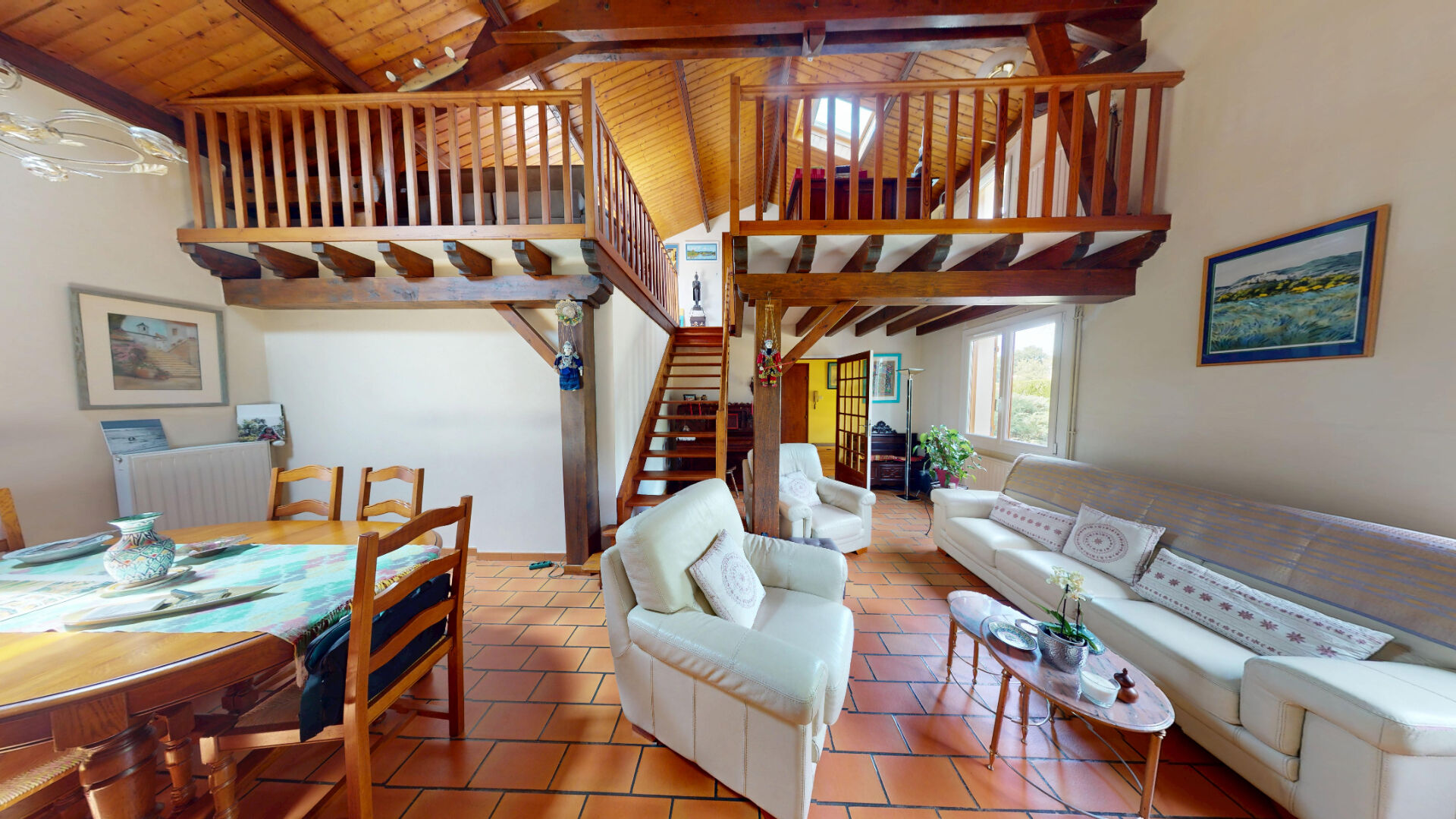 À l'étage, une vaste mezzanine dessert un espace bureau idéal pour le télétravail ou les loisirs, 2 chambres supplémentaires et une salle d'eau. L'ensemble est parfaitement adapté à la vie de famille, avec de nombreuses possibilités d'aménagement.