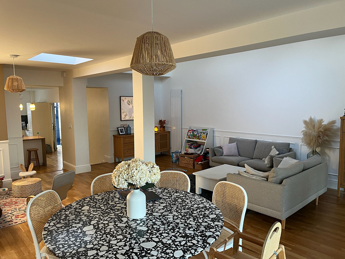 - Au rez-de-chaussée : entrée, wc, cuisine aménagée et équipée, grand séjour de 42m2, loggia ainsi que de nombreux rangements.