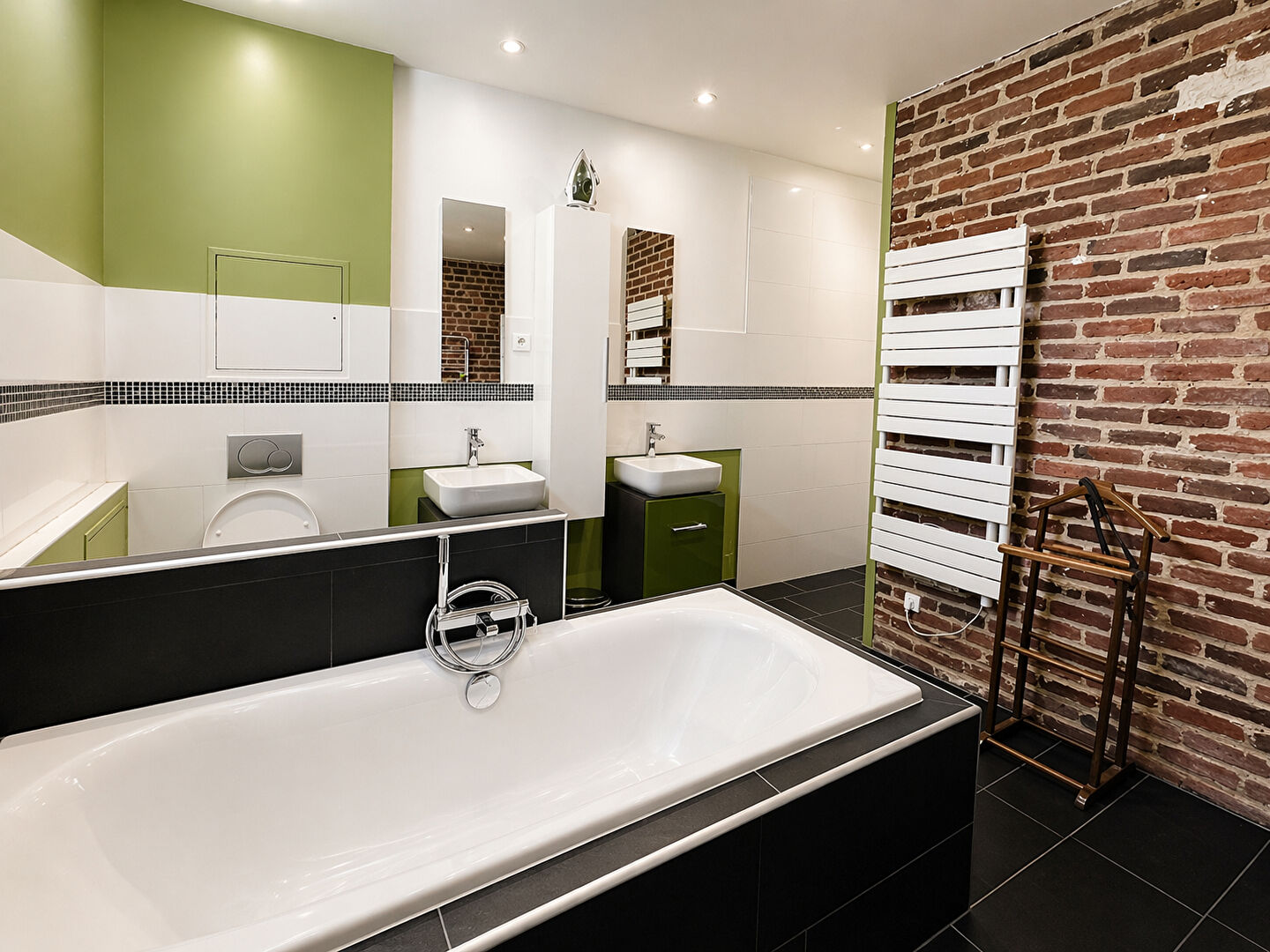 En rez-de-jardin, la maison dispose d'un grand bureau, parfait pour le télétravail ou une activité indépendante. Vous y trouverez également une spacieuse salle de bains avec baignoire, grande douche à l'italienne et toilettes.