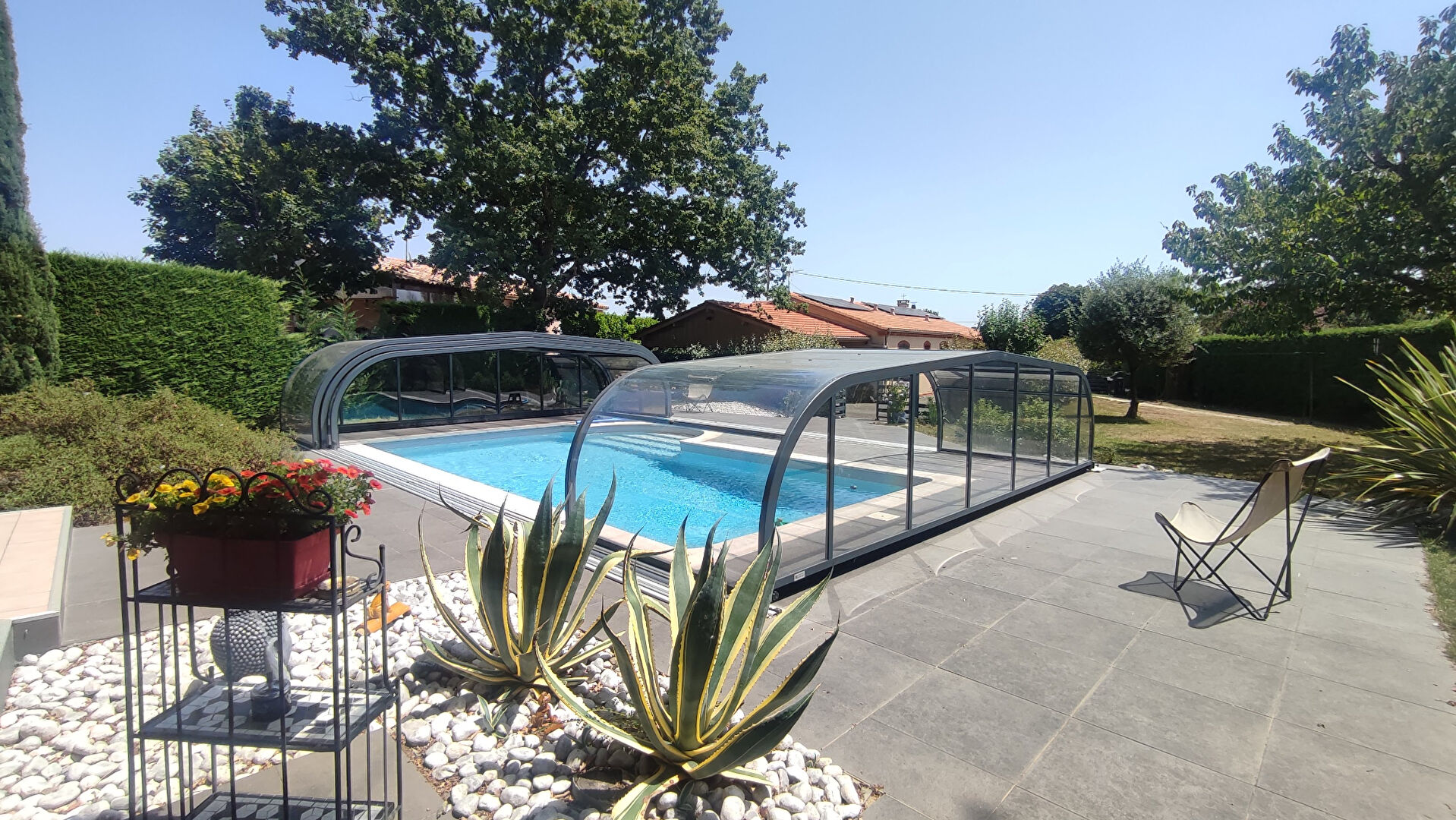 A l'extérieur : Un appentis de plus de 35m² pour protéger vos véhicules, équipée d'une recharge pour votre véhicule électrique, et nombreuses places de stationnement, un espace détente à été aménagé autour de la piscine au sel avec terrasses entièrement dallées, jardin paysagé, barbecue, promettant de beaux moments en famille.