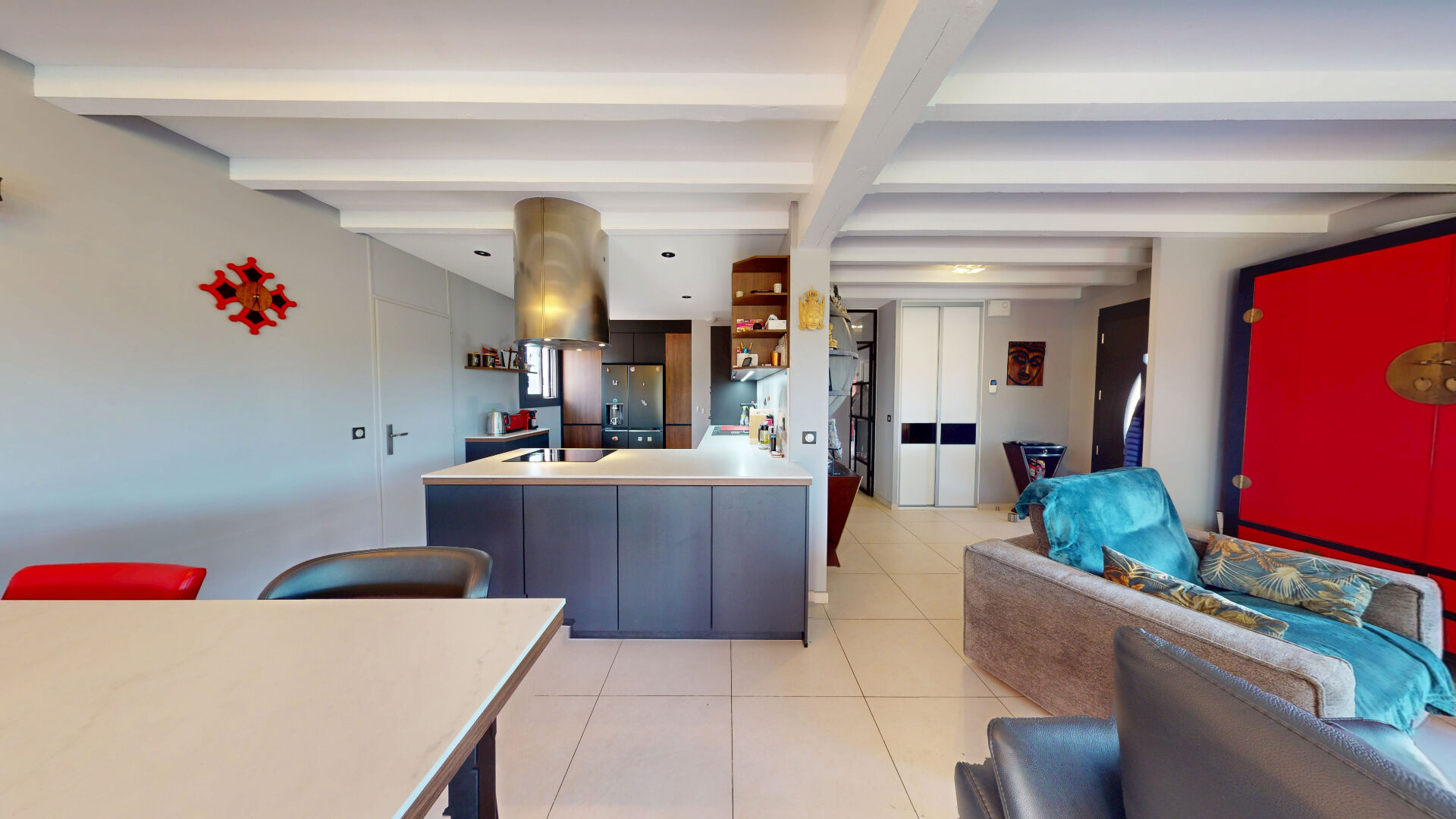 La maison principale entièrement climatisée vous offre un hall d'entrée, une spacieuse pièce de vie de plus de 67m² avec cuisine moderne entièrement équipée et aménagée avec un bel ilot central, 3 chambres avec placard, une salle de bain (double vasque, baignoire et douche), un espace bureau ou buanderie, et un wc séparé.