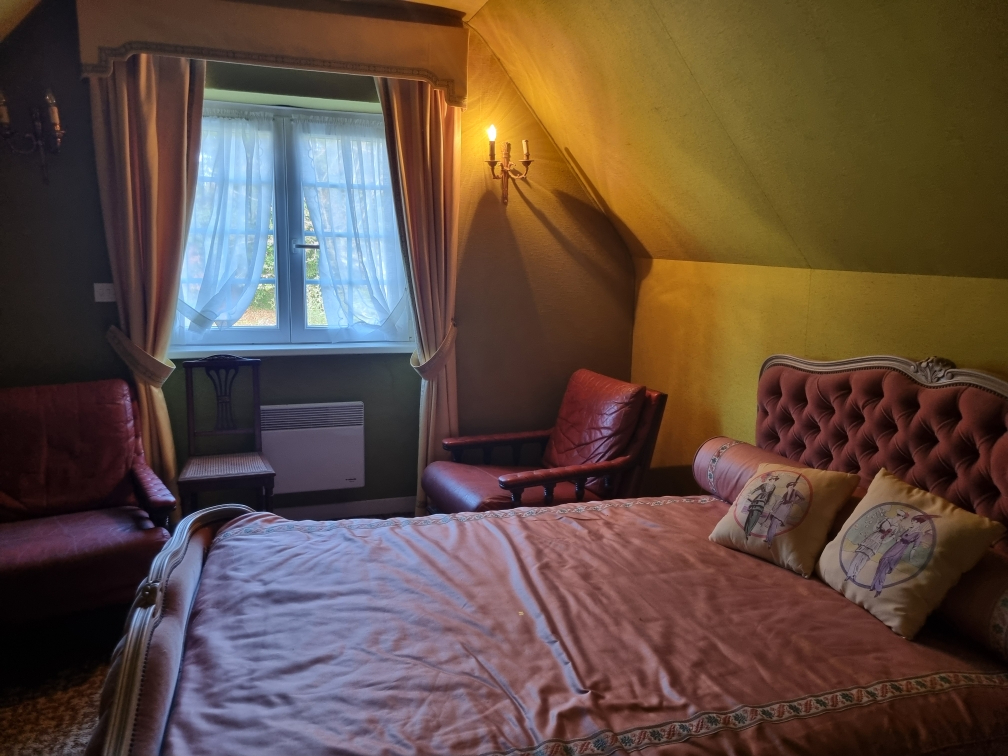 Édifiée sur un terrain paysager de 2 170 m², cette demeure de caractère en pierre, avec son toit de chaume traditionnel et ses volets bleus typiques, offre une atmosphère chaleureuse et pleine de cachet.