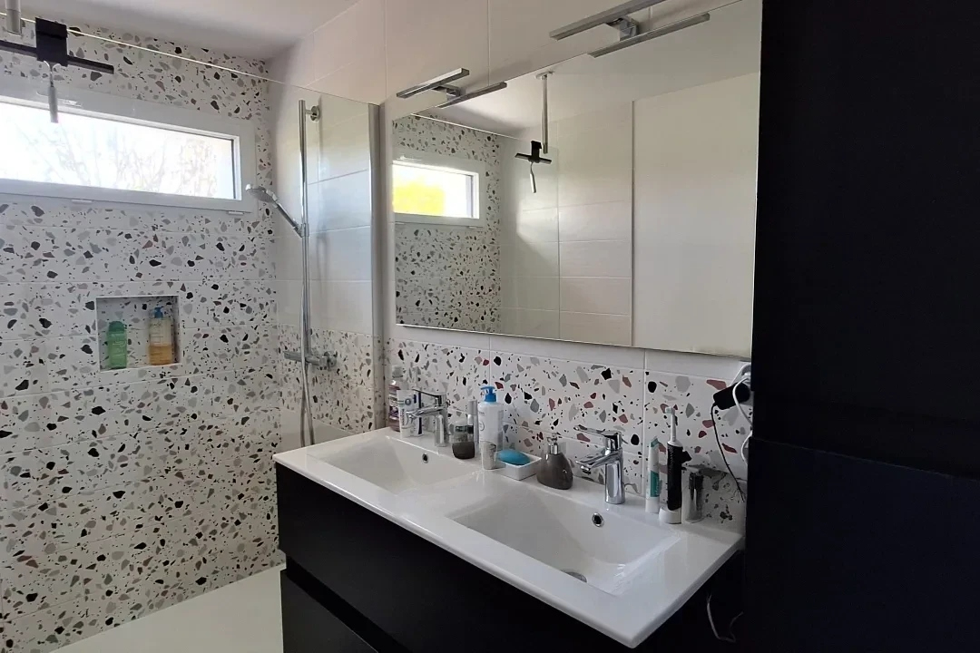 Le rez-de-chaussée se compose d'une entrée, d'une salle d'eau, d'un toilette séparé et d'une chaleureuse et lumineuse pièce de vie de plus de 50 m² agrémentée d'un poêle à pellet haut de gamme, avec sa cuisine ouverte aménagée et équipée.