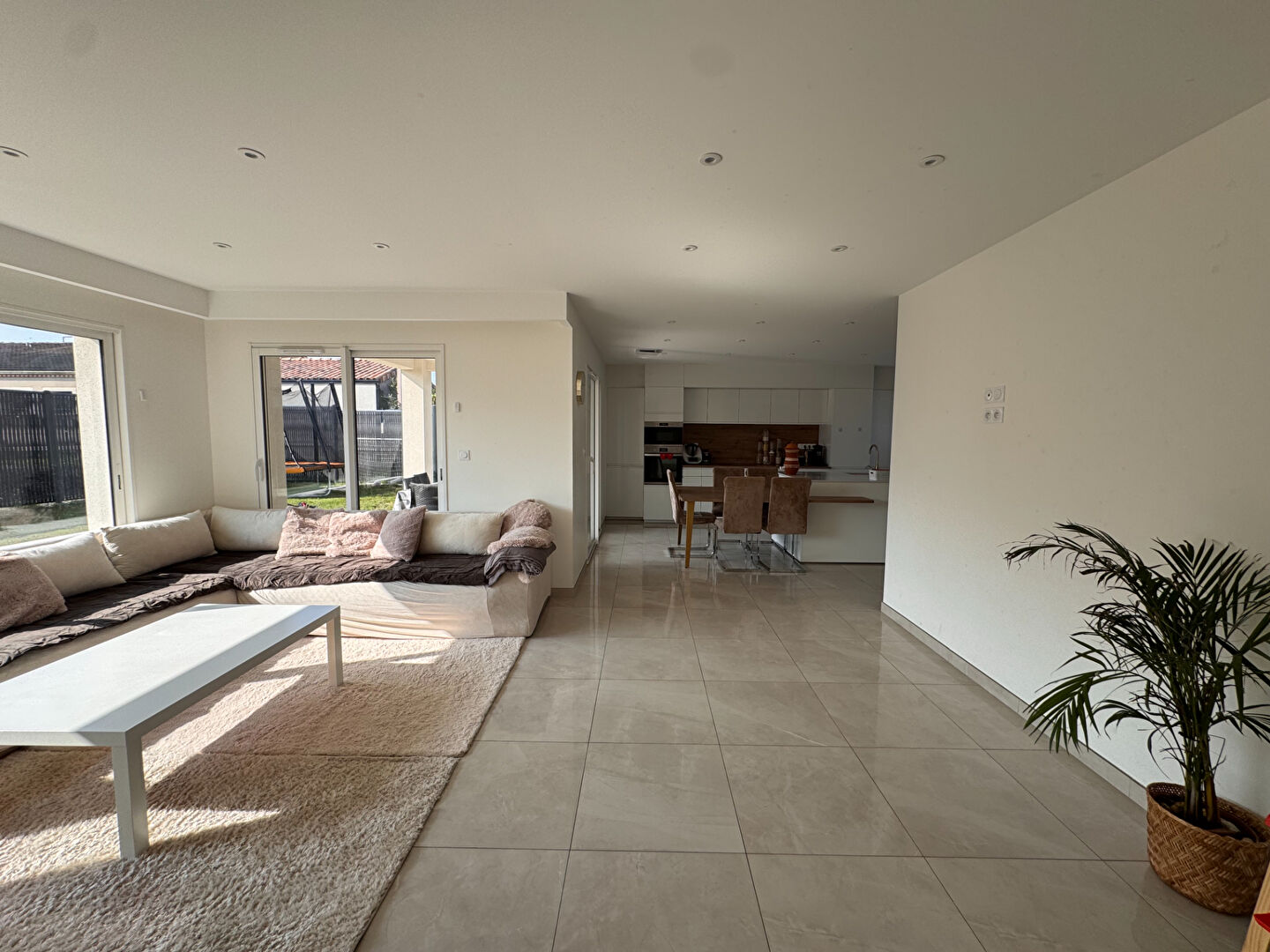 Dès l'entrée, vous découvrirez une spacieuse pièce de vie baignée de lumière, composée d'un salon-séjour convivial avec une cuisine ouverte aménagée et équipée, avec son coin repas, offre un espace pratique et chaleureux pour toute la famille.