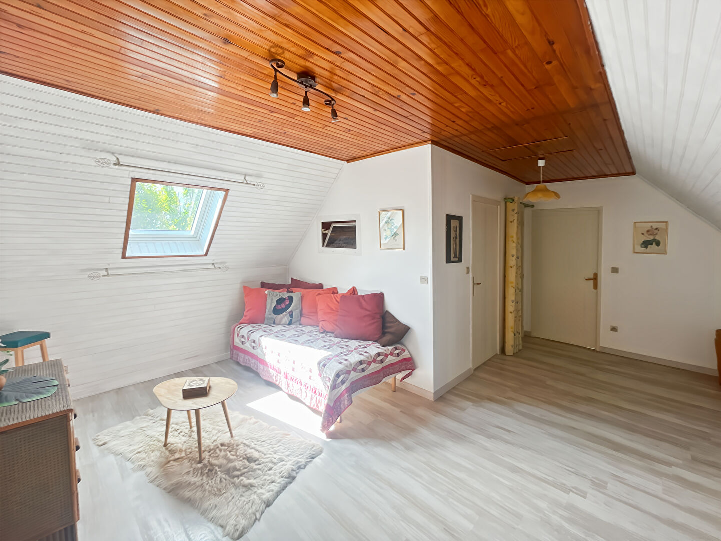 À l'étage, un grand dégagement pouvant servir de chambre, de second salon ou d'espace bureau dessert deux chambres supplémentaires, une deuxième salle de bains ainsi qu'un toilette indépendant.