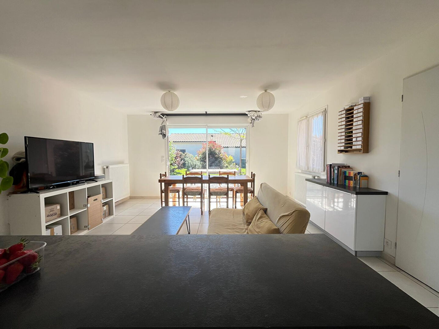 Vous arriverez dans un espace de vie lumineux de près de 30m² avec sa cuisine aménagée, équipée et récente, son cellier attenant et son espace séjour.