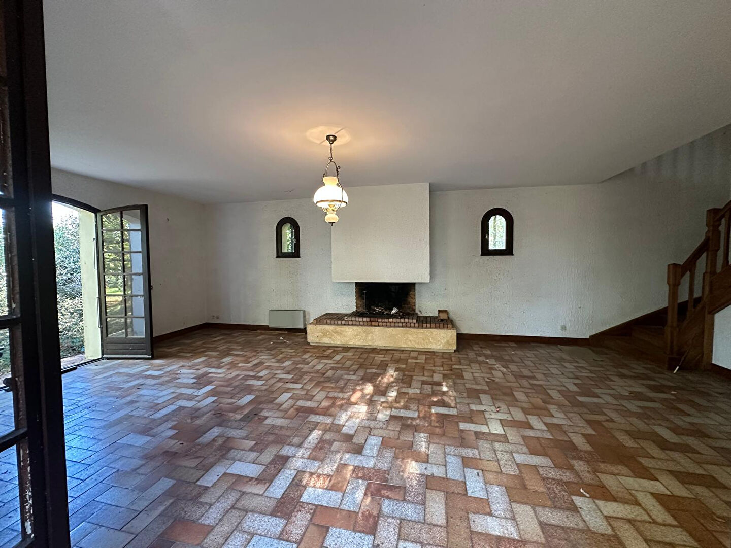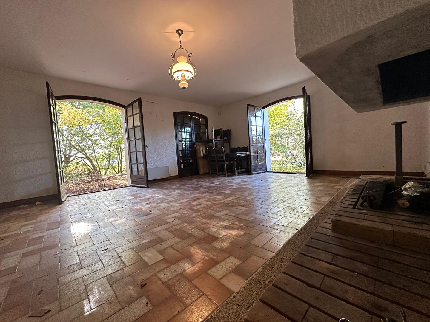 un vaste séjour déplafonné avec cheminée et grandes ouvertures donnant sur une large terrasse,