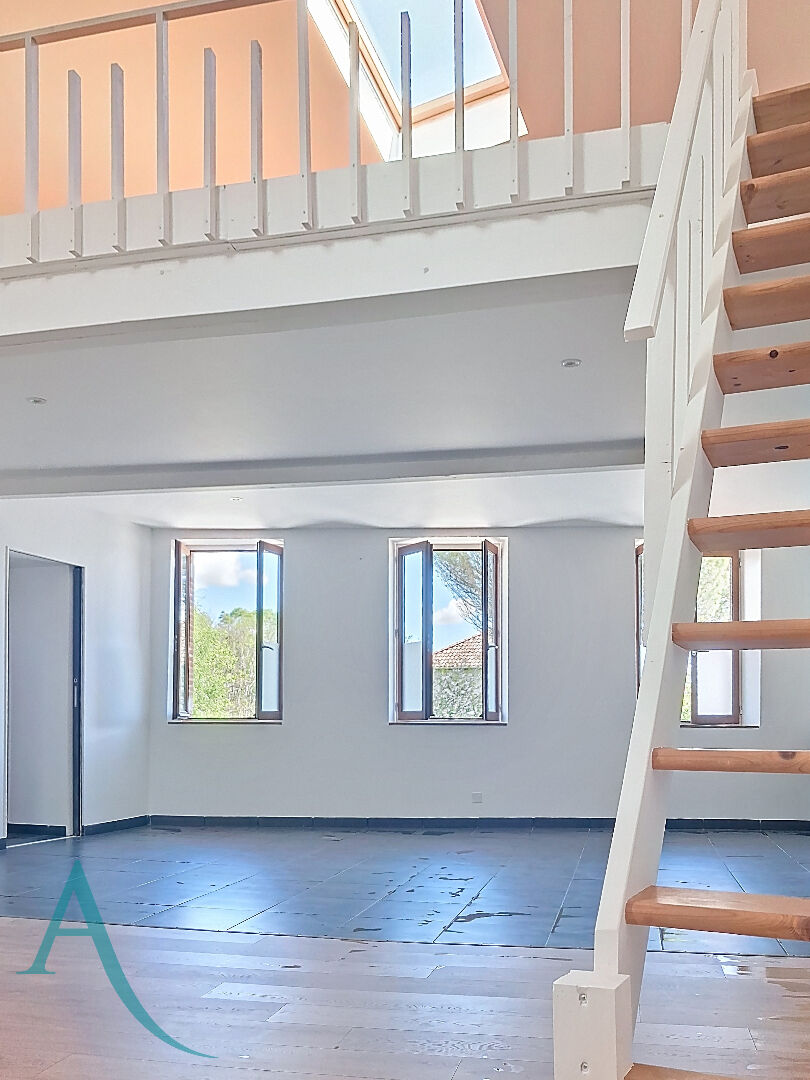 A l'étage, une grande pièce de vie d'environ 50m², avec sa cuisine ouverte sur le séjour, une mezzanine , un espace nuit avec sa chambre, sa salle d'eau et son wc.
