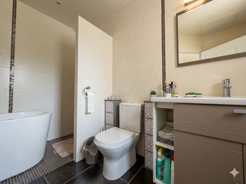 L'espace nuit se compose d'une suite parentale avec chambre, dressing, salle d'eau et wc privatifs, ainsi que d'un second espace indépendant comprenant deux chambres, une salle d'eau et wc.