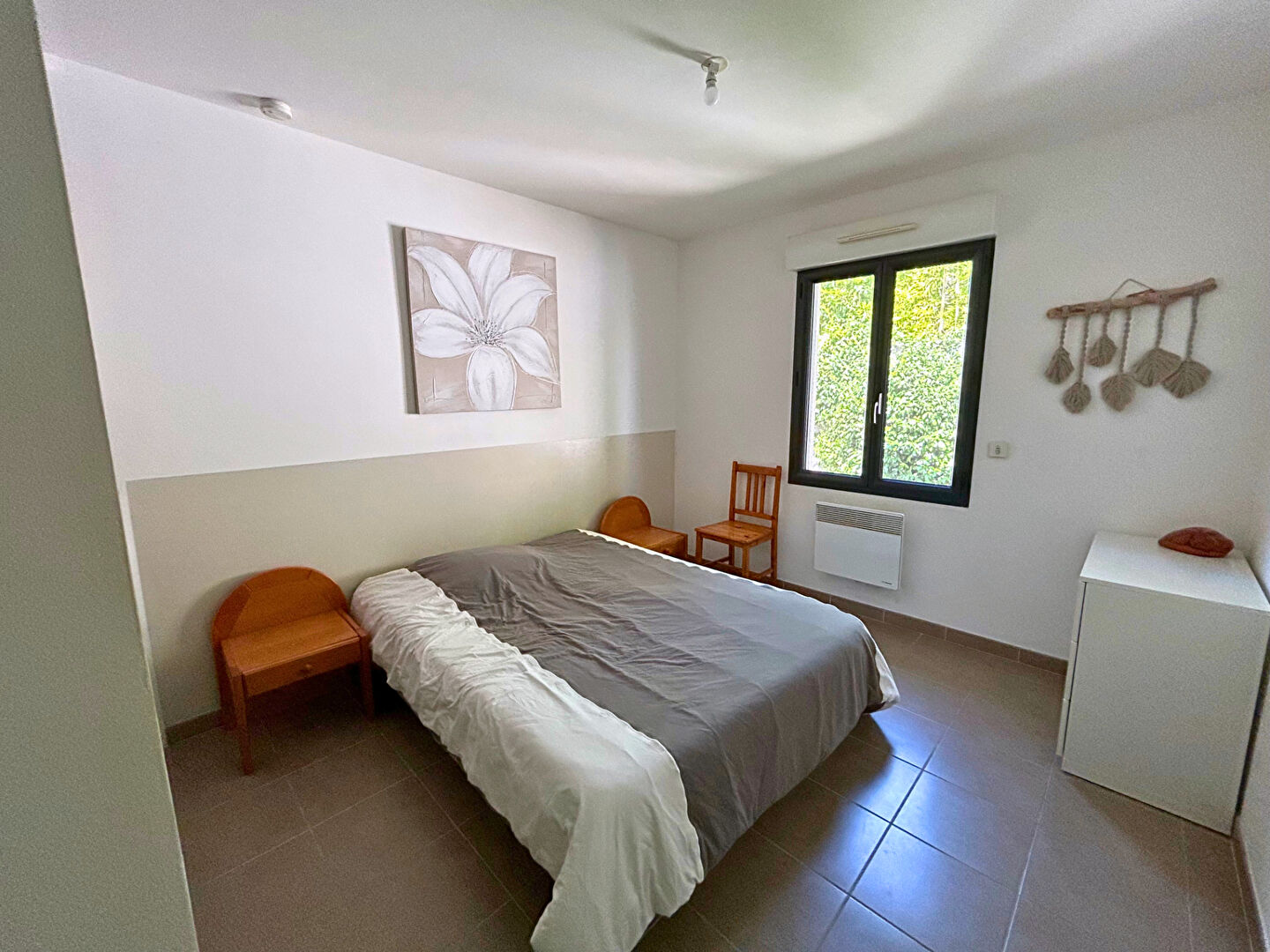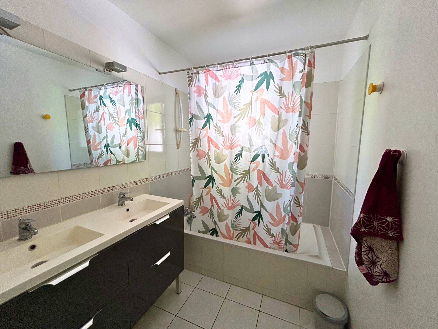 L'entrée s'ouvre sur un vaste séjour traversant, lumineux et climatisé, donnant accès à une première terrasse de 15 m² et un jardin intimiste. La cuisine américaine, entièrement meublée et équipée, s'intègre parfaitement à l'espace de vie.