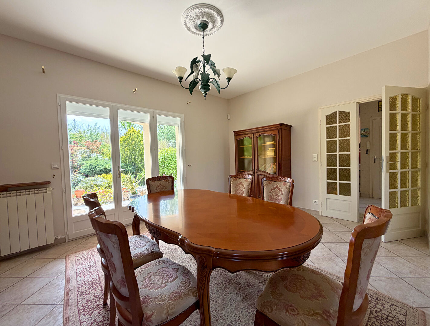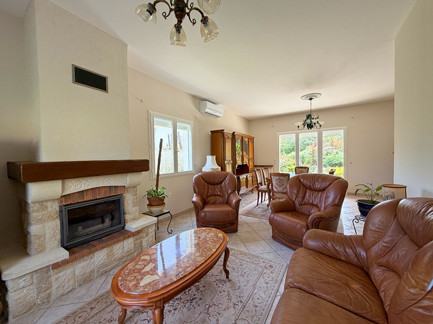 Comprenant : hall d'entrée avec placard, séjour/salle-à-manger avec vue imprenable sur le jardin, cuisine indépendante spacieuse, dégagement avec placard distribuant trois chambres climatisées, salle d'eau avec baignoire et douche, ainsi que des WC séparés. Un grand garage de 60m2 aménageable et une cave de 20 m2 viennent compléter le tout.