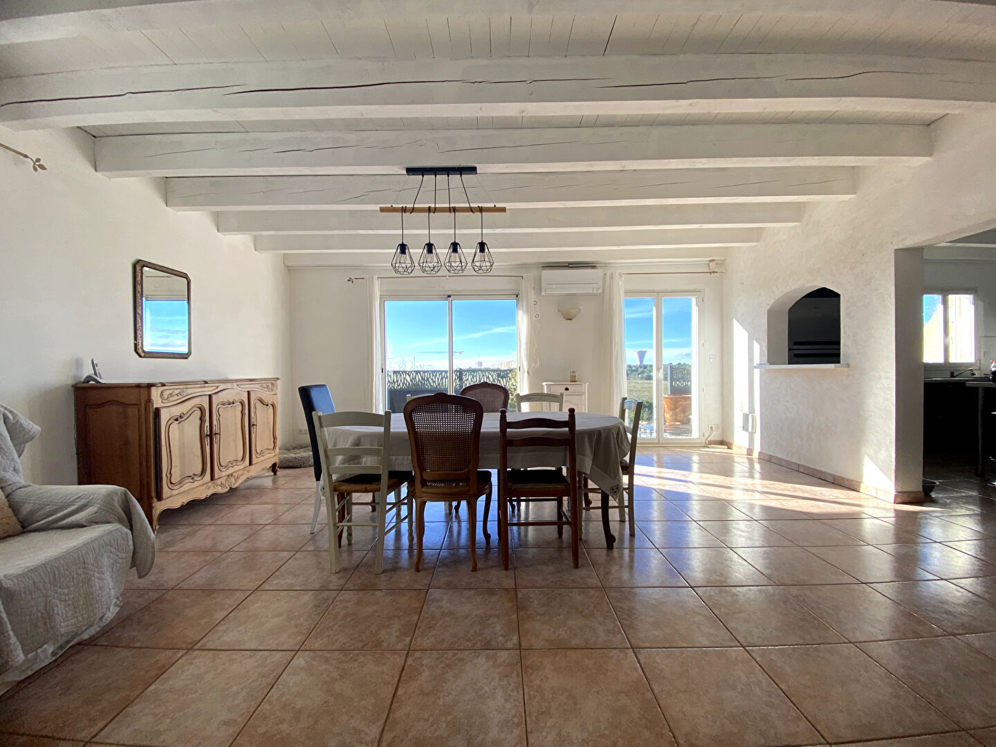 Dès l'entrée, vous accédez à une pièce de vie d'environ 70 m² climatisée avec en son centre un poêle à bois et la cuisine semi ouverte meublée et équipée. Le rez-de-chaussée comprend également un dégagement desservant une toilette indépendant , une salle d'eau et une arrière cuisine.