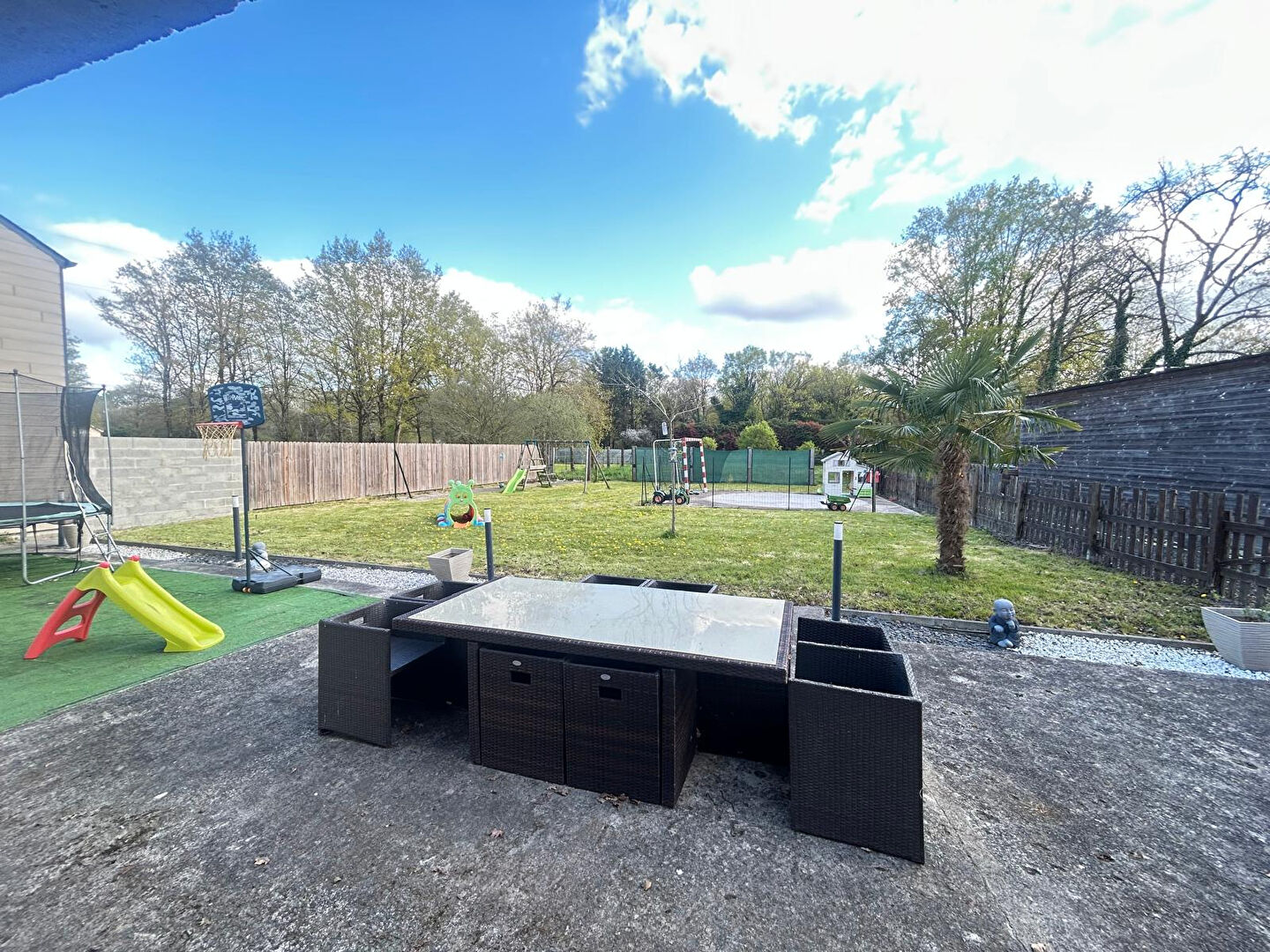 Le terrain est aujourd'hui divisé en deux parties. Une première partie paysagée permet de profiter pleinement des extérieurs, tandis que la seconde est actuellement utilisée pour accueillir un animal mais peut facilement être réintégrée à l'ensemble du jardin selon les besoins. Le terrain est piscinable et offre également encore des possibilités de construction, permettant d'envisager un agrandissement ou la création d'une dépendance.