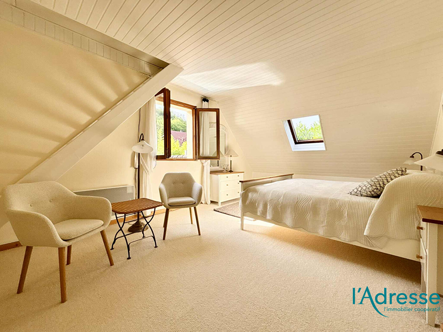 À l'étage : un vaste dégagement lumineux dessert deux belles chambres : l'une avec accès à un balcon, l'autre disposant d'un accès à un grenier aménageable, parfait pour un espace supplémentaire. Des rangement sous combles optimisent intelligemment l'espace.