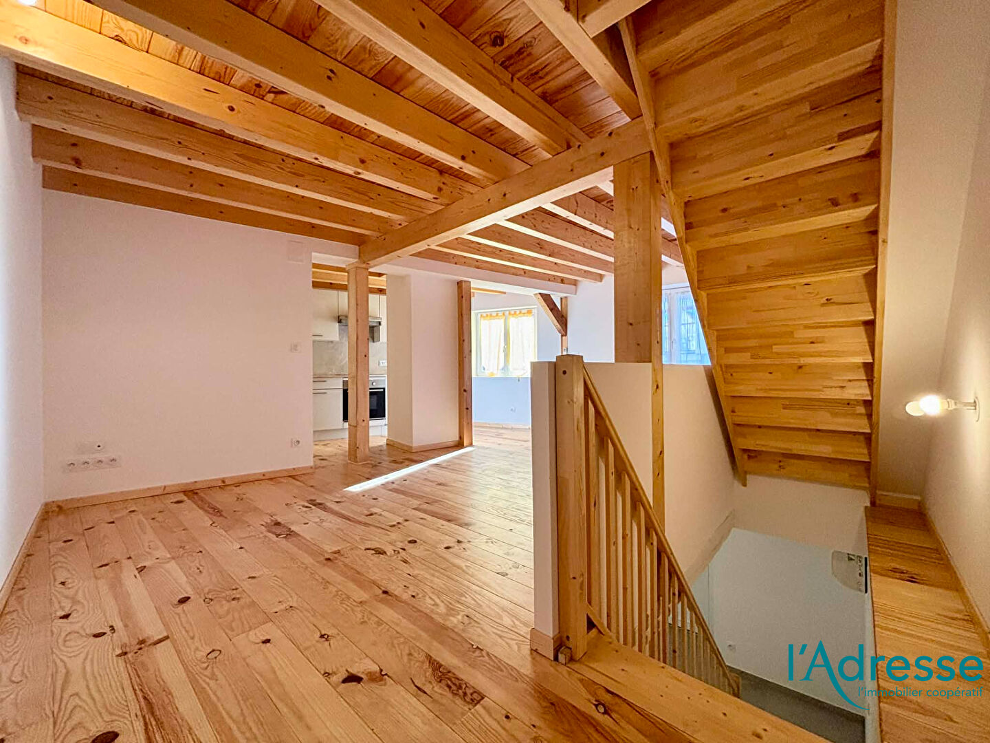 - Au 1er étage : une grande chambre et une belle pièce de vie baignée de lumière.