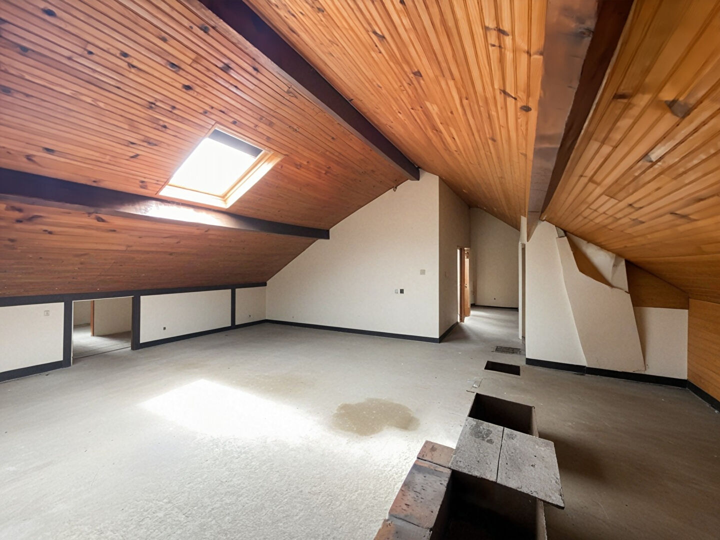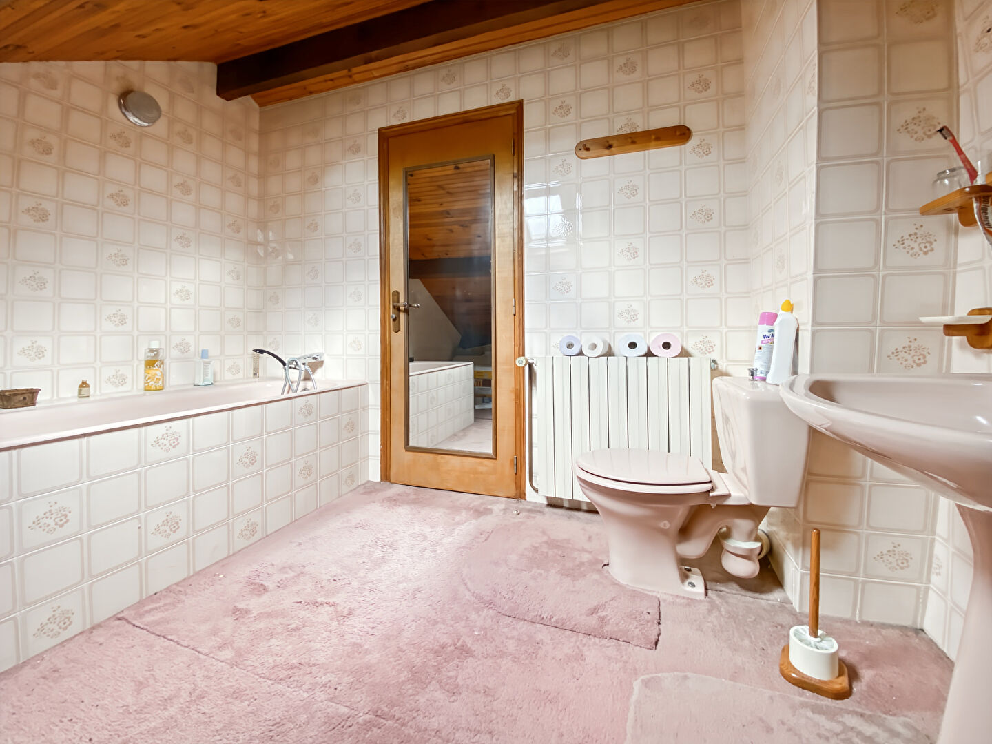 A l'étage (dalle béton) : Pièce palière servant de bureau, une chambre et une salle de bains avec wc.