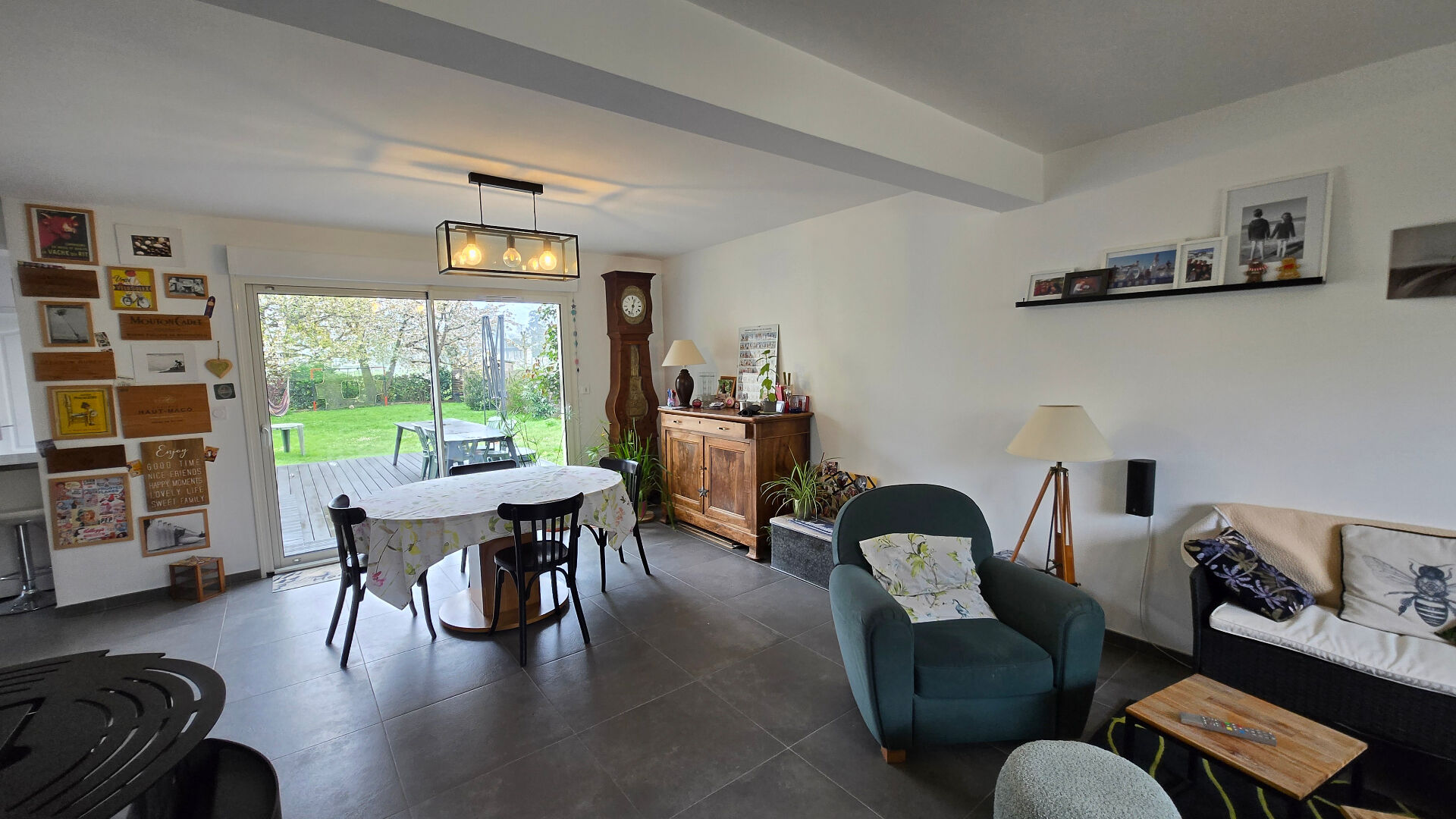 Dès l'entrée, vous serez séduits par une belle pièce de vie traversante spacieuse et lumineuse, agrémentée d'un poêle à granulés, offrant un confort optimal.