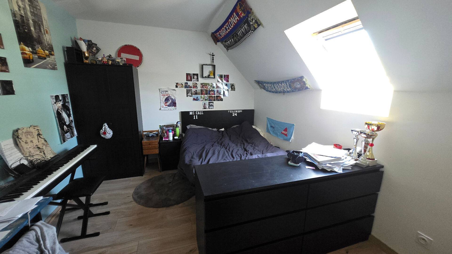 A l'étage, une mezzanine dessert un local technique, deux grandes chambres ainsi qu'une salle de bains.