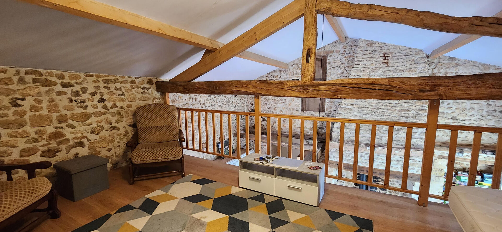 Dès l'entrée, vous découvrirez une cuisine fonctionnelle, un vaste salon-séjour cathédrale avec sa mezzanine et son accès direct à une terrasse intimiste, parfaite pour profiter des beaux jours en toute tranquillité.