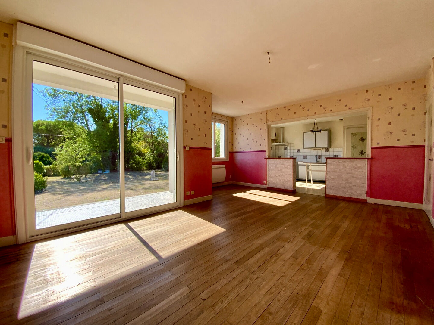 Agréable maison style année 70 composée d'une entrée desservant une pièce de vie lumineuse avec cuisine semi-ouverte et terrasse/auvent.