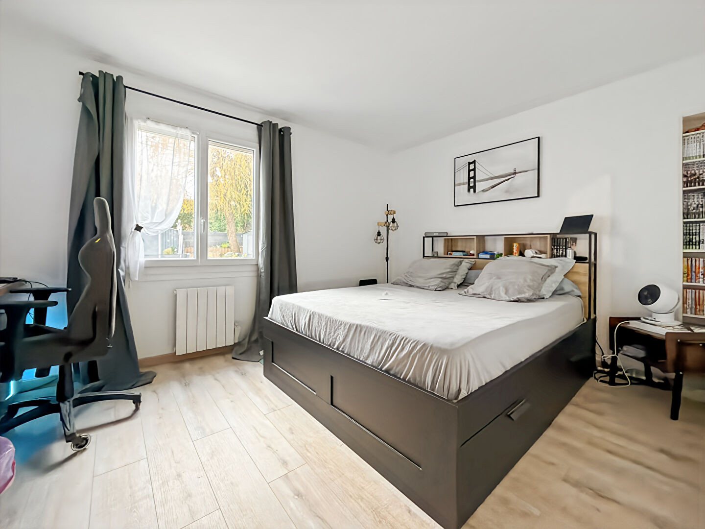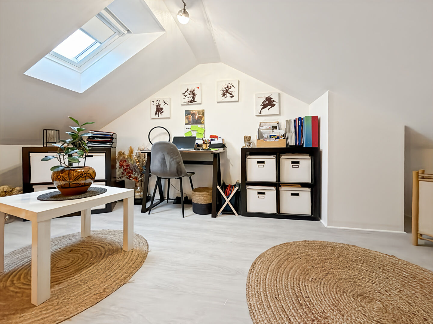 À l'étage, les combles métamorphosés offrant un espace remarquable : bureau, grande chambre avec coin bureau, salle d'eau + WC , parfait pour un espace indépendant, télétravail ou suite d'adolescent.