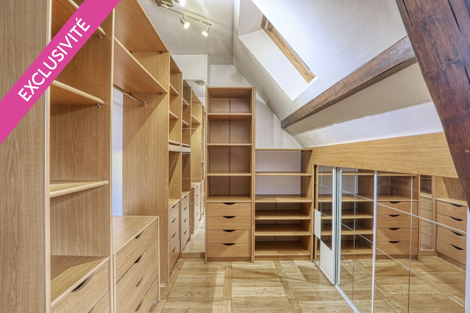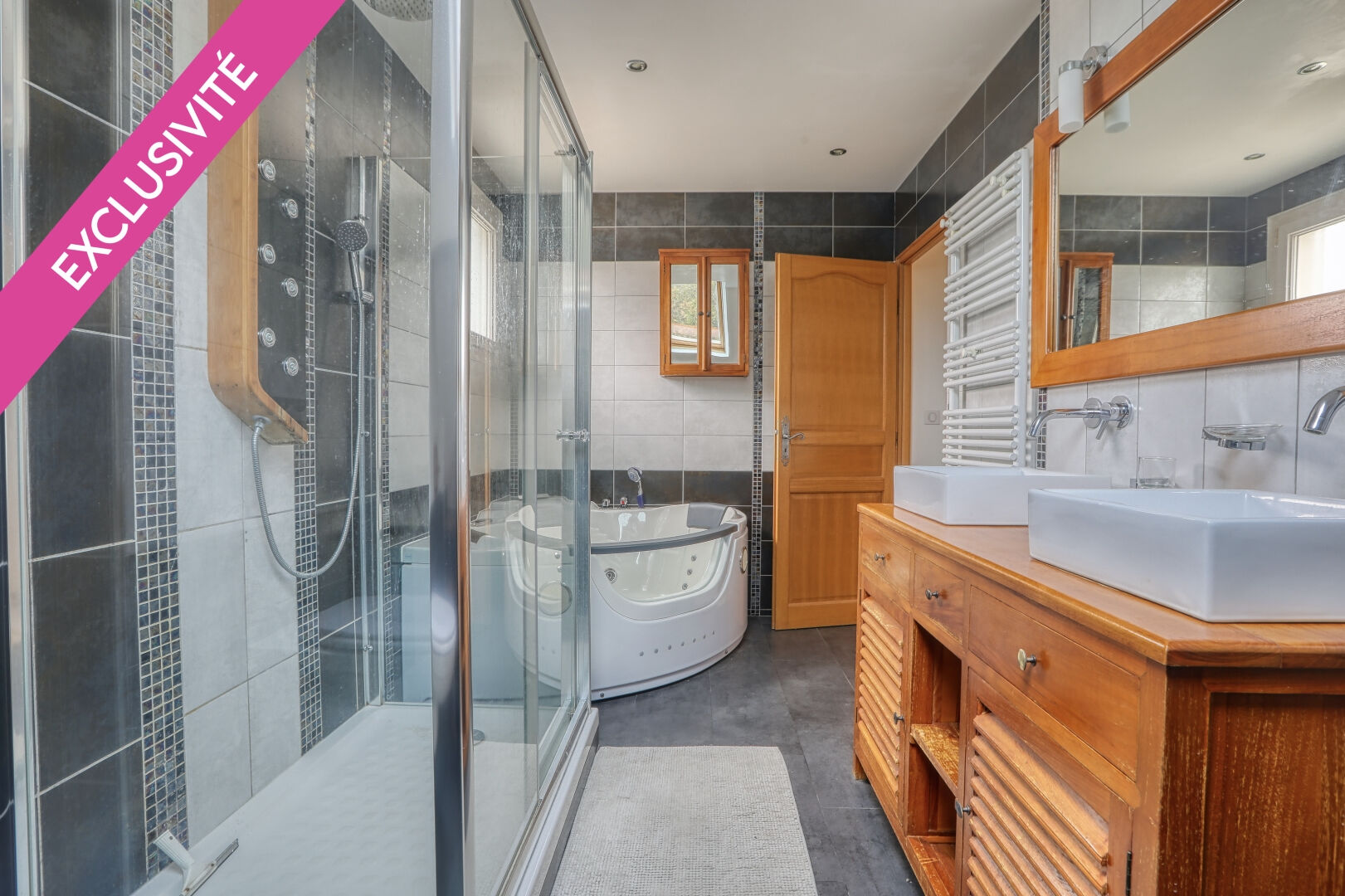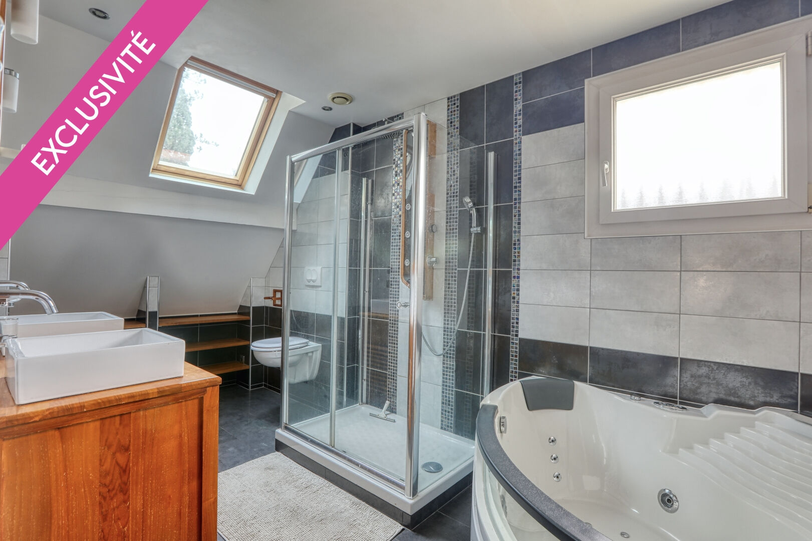 À l'étage, un vaste palier distribue un bureau et deux grandes chambres, dont l'une bénéficie d'un dressing aménagé. La salle de bains propose des prestations haut de gamme, avec une baignoire balnéo et une douche à l'italienne, offrant un véritable espace de détente.