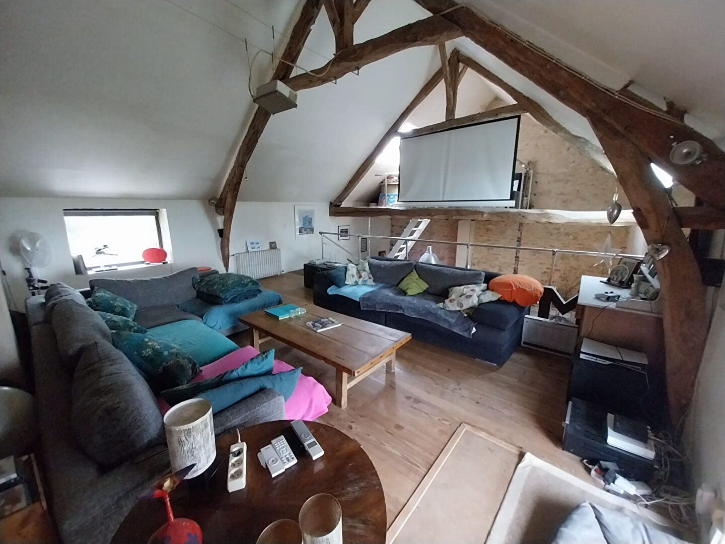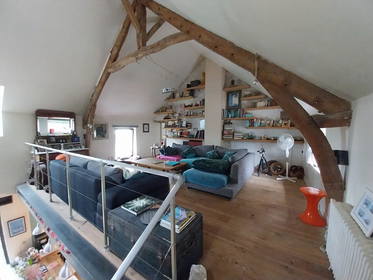 A l'étage, le salon profite de volumes remarquables. Une mezzanine, actuellement aménagée en bureau surplombe cet espace chaleureux, pensé pour des moments de partage en famille ou entre amis.