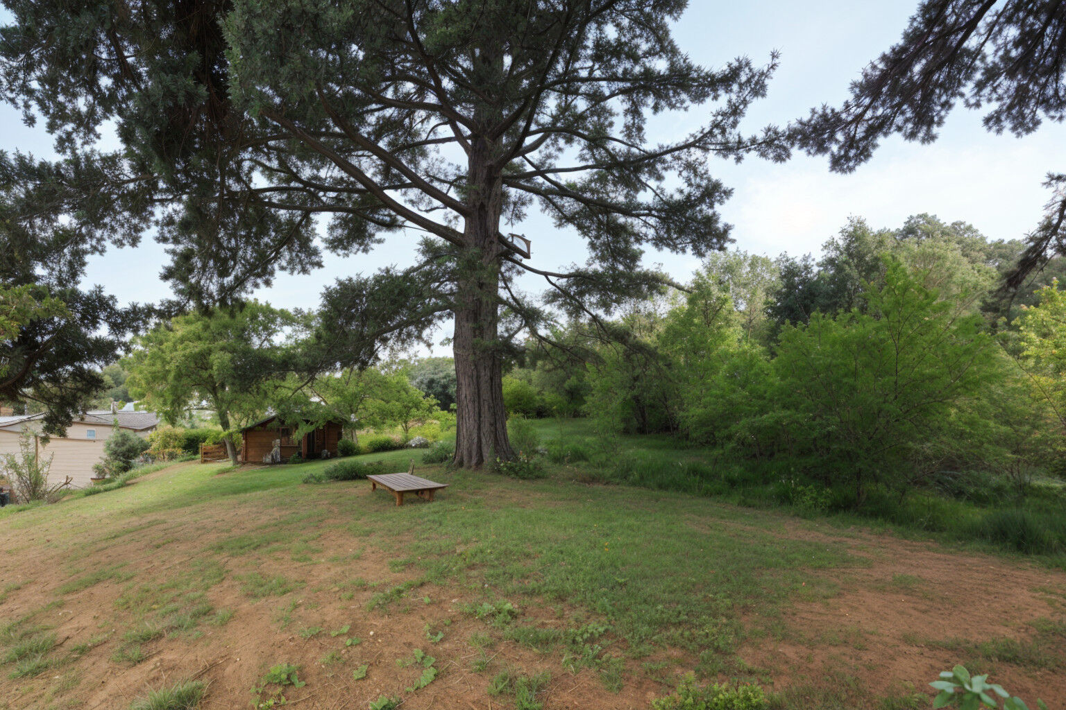 À l'arrière de la maison, un jardin arboré avec deux cèdres accueille une vaste terrasse sans vis-à-vis, parfaite pour les instants de détente.
