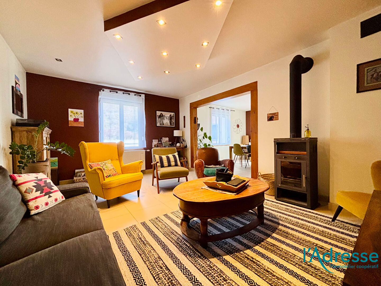 - Un vaste salon/salle à manger d'environ 35 m² avec poêle à bois ;