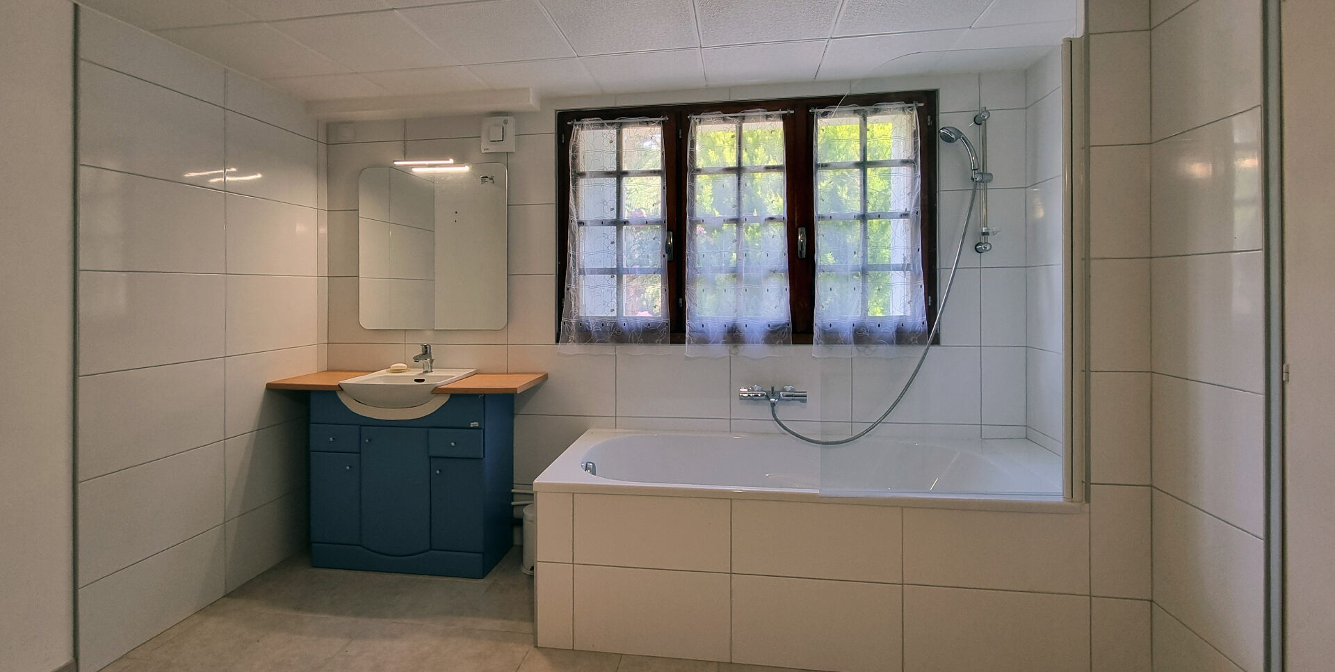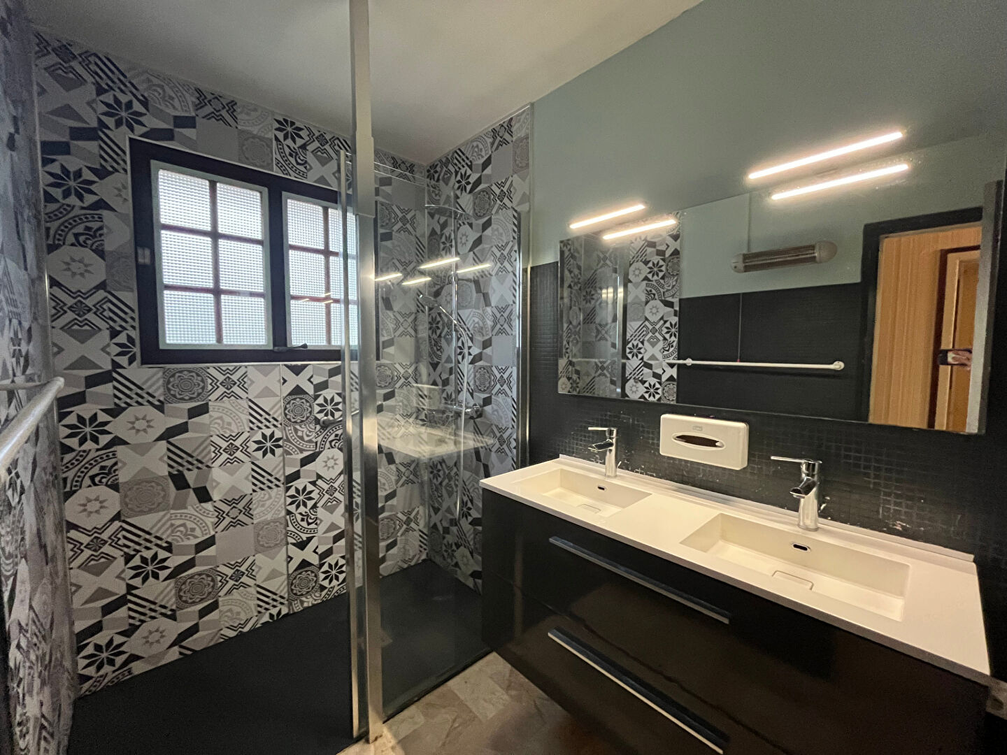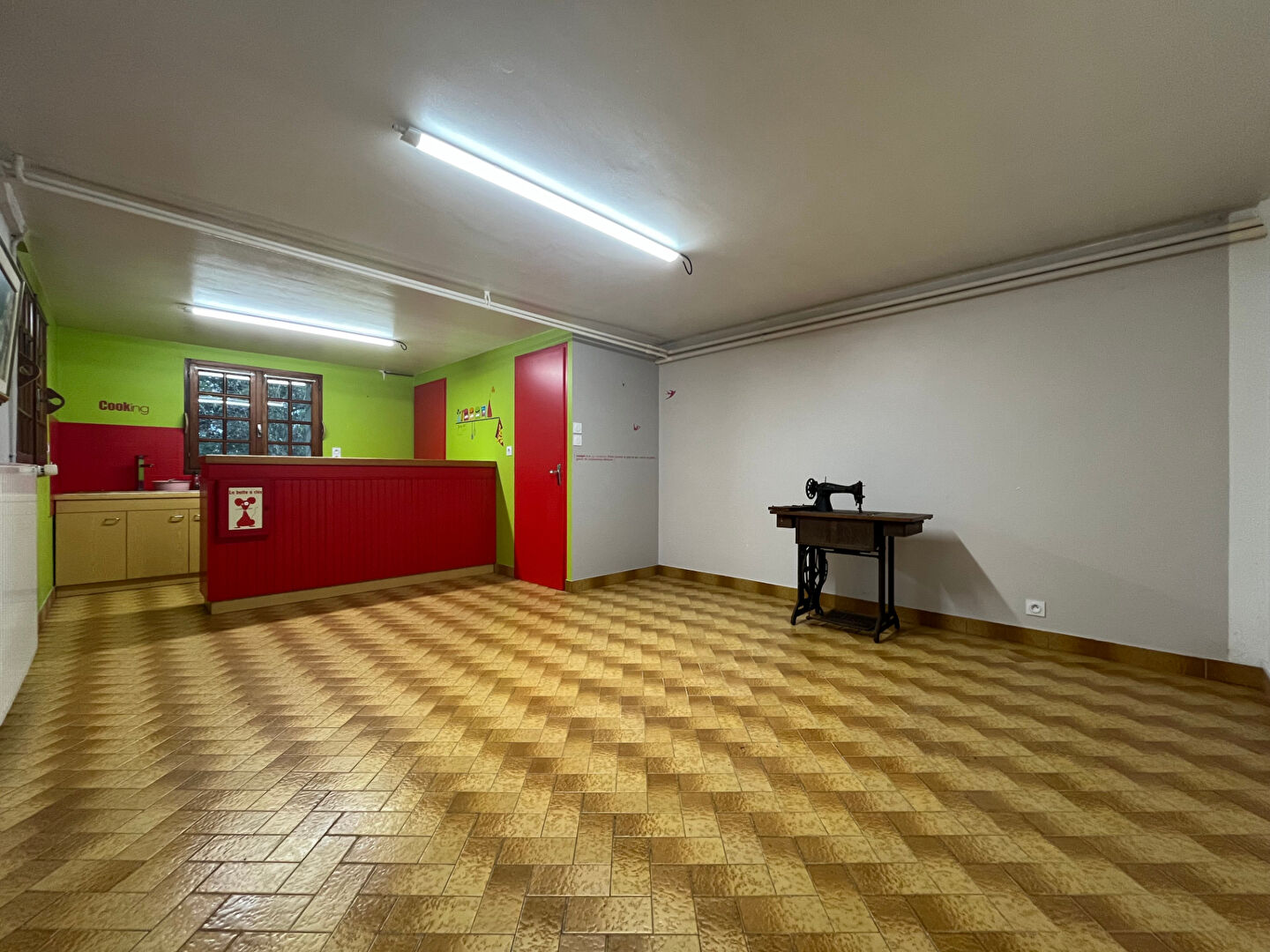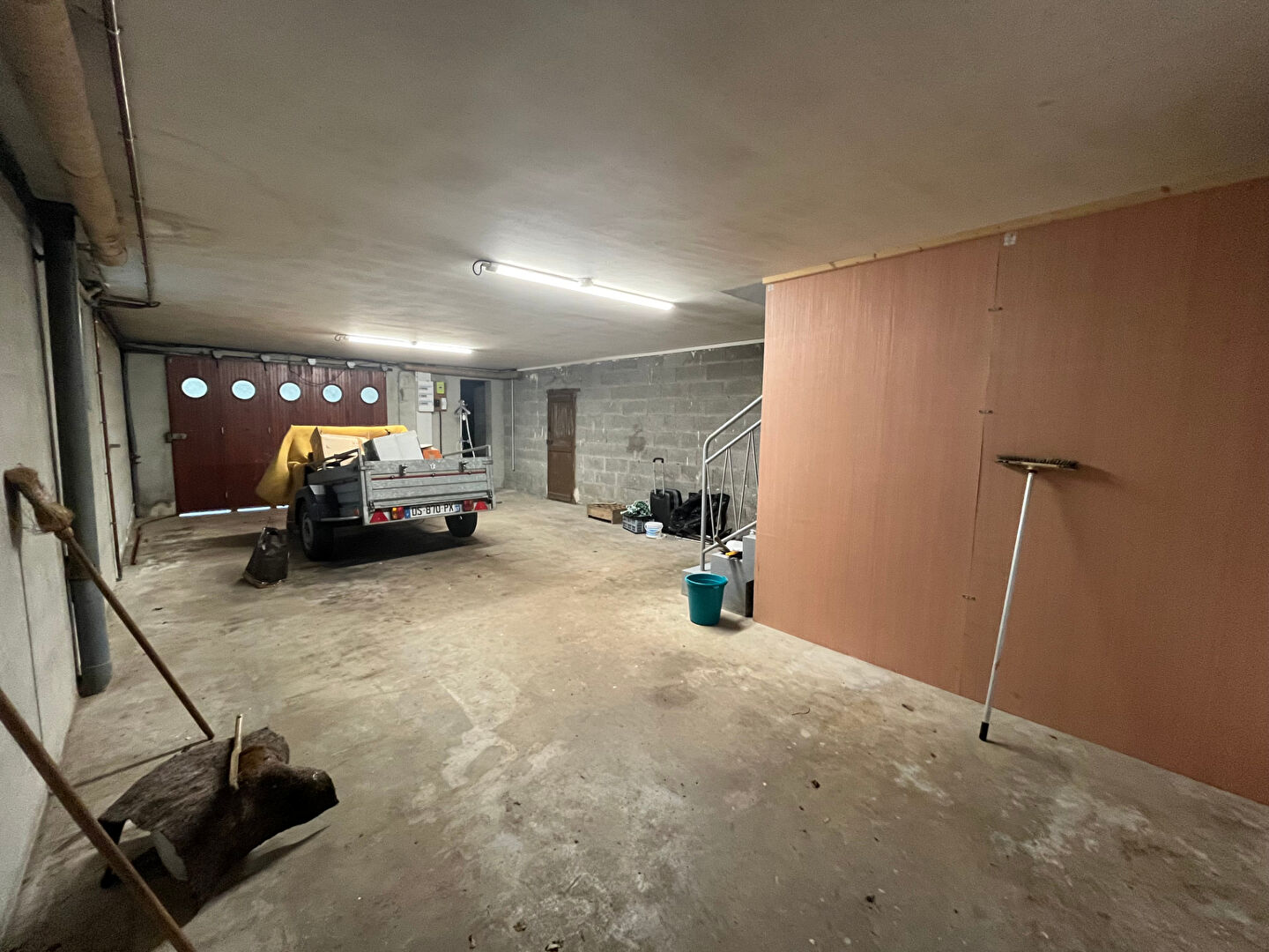 Le rez-de-chaussée comprend un studio indépendant avec cuisine, chambre, coin bain et douche, WC séparé, ainsi qu'un grand garage d'environ 45 m² avec buanderie et cave. Cet espace peut convenir à une activité professionnelle ou à de la location.