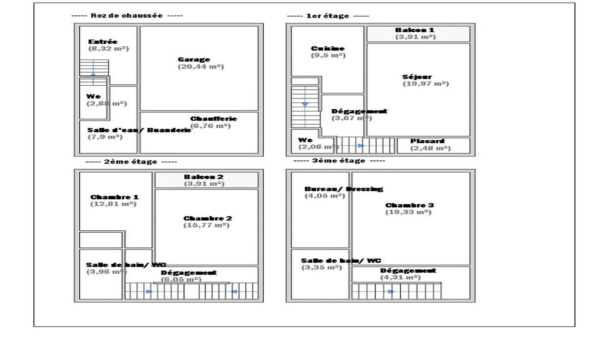 - au 2ème étage ( grenier aménagée): une chambre, un bureau ou dressing, une salle de bain avec WC.
