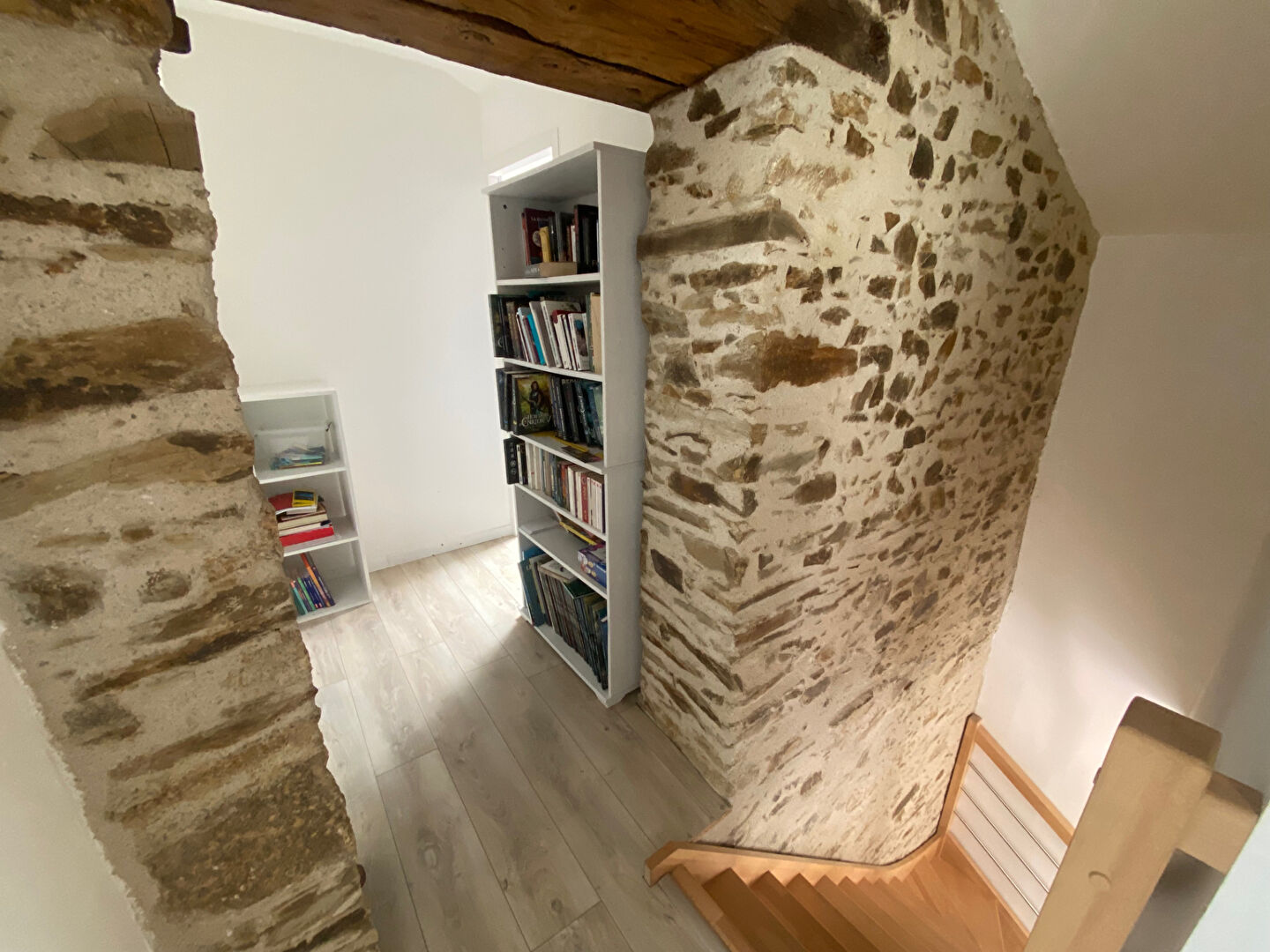 Elle se compose au rez-de-chaussée d'une pièce de vie de 31m2 avec cuisine ouverte aménagée et équipée et mur en pierres apparentes, d'une lingerie et d'un WC.