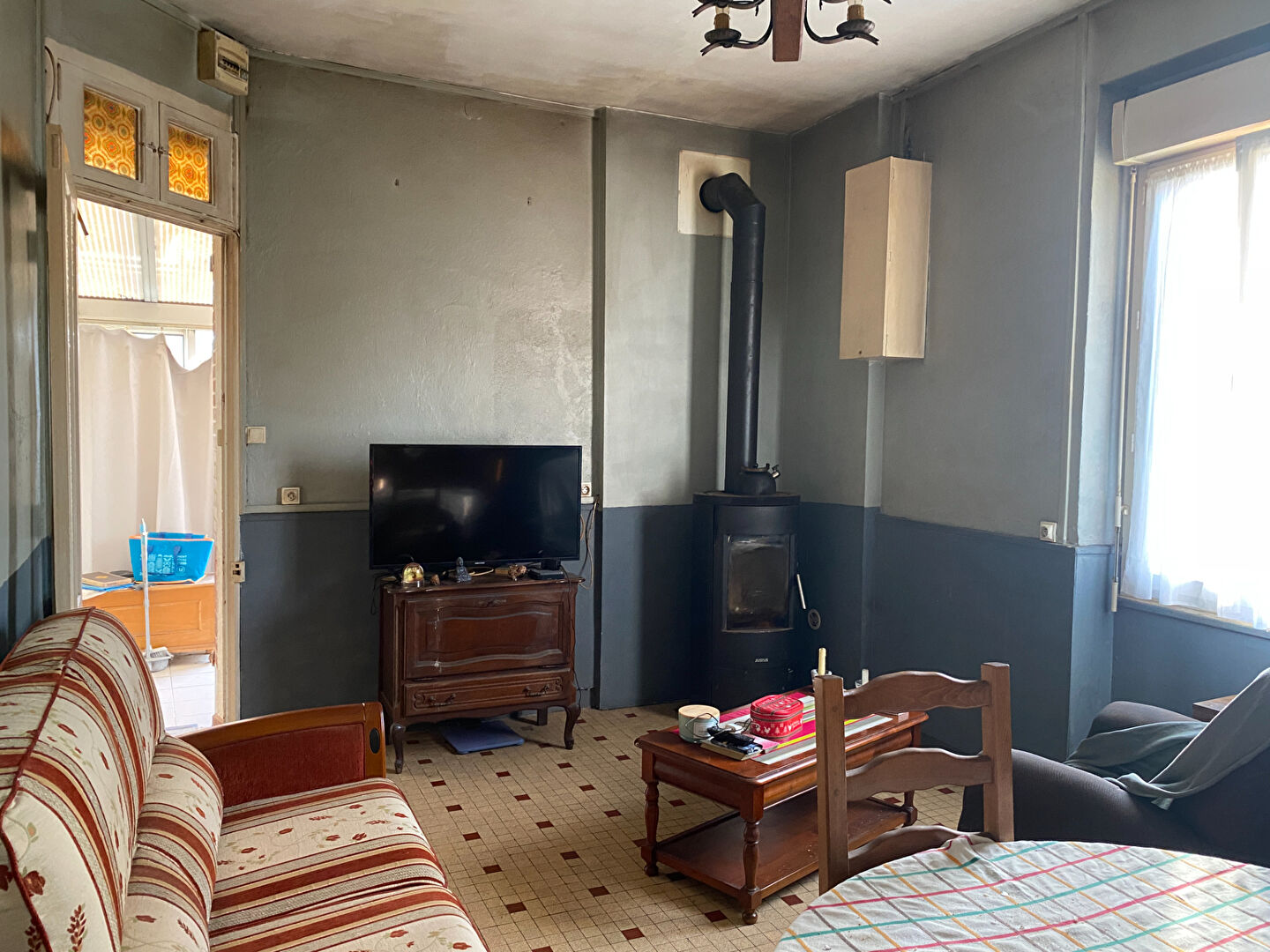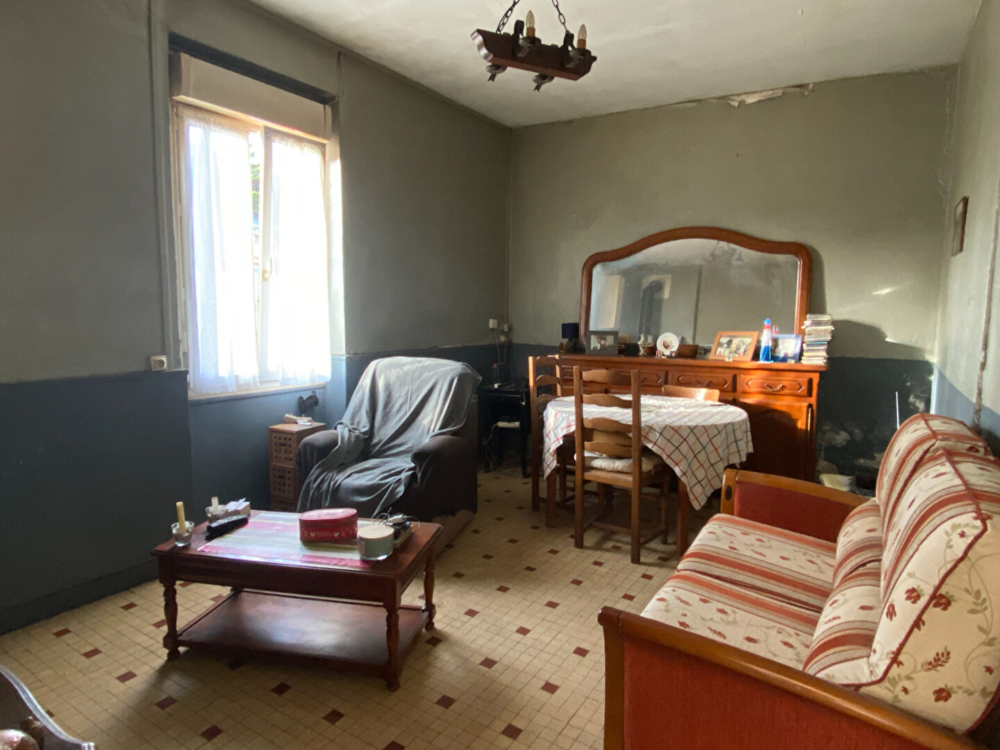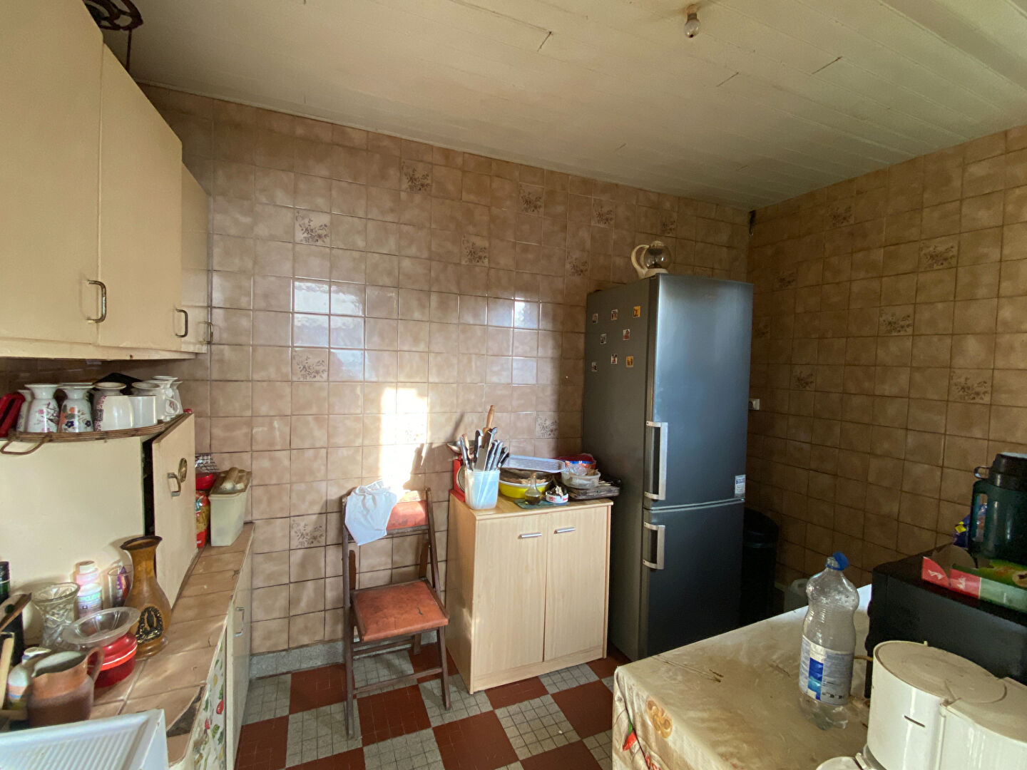 Maison comprenant : une véranda, un salon avec poêle à bois, une cuisine, une chambre.