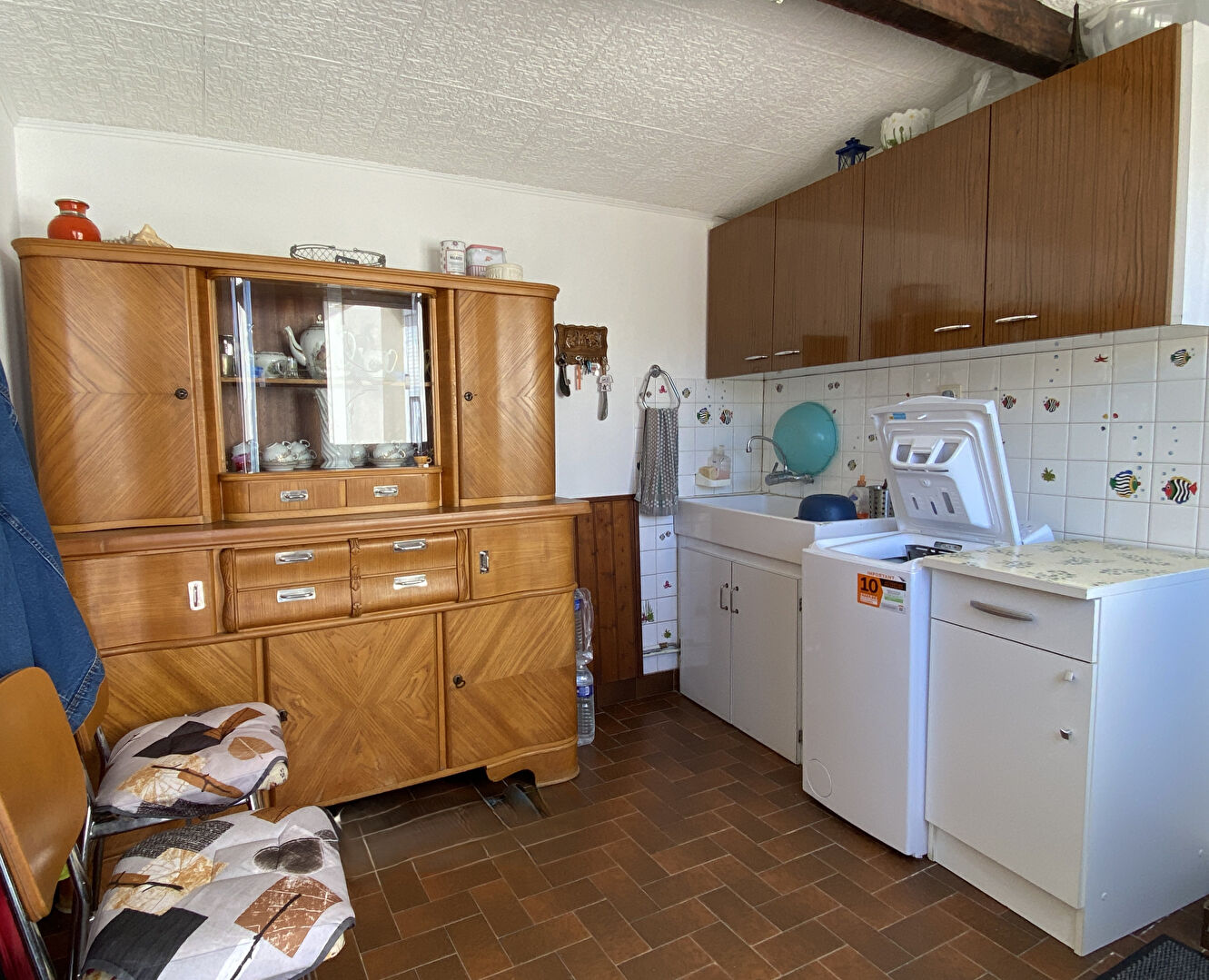 Un hall d'entrée, un salon-séjour menant à une cuisine aménagée, ainsi qu'une lingerie.