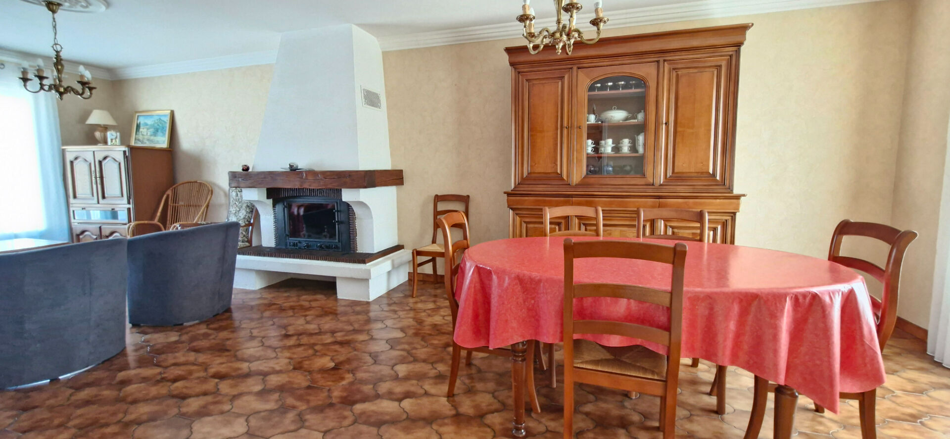 Cette maison est composée d'une entrée ouverte sur salon séjour avec cheminée insert, cuisine AE, dégagement vers 3 chambres, salle de douches, wc. Véranda. Sous-sol total de 100m² carrelé et disposant d'une douche et d'un wc.