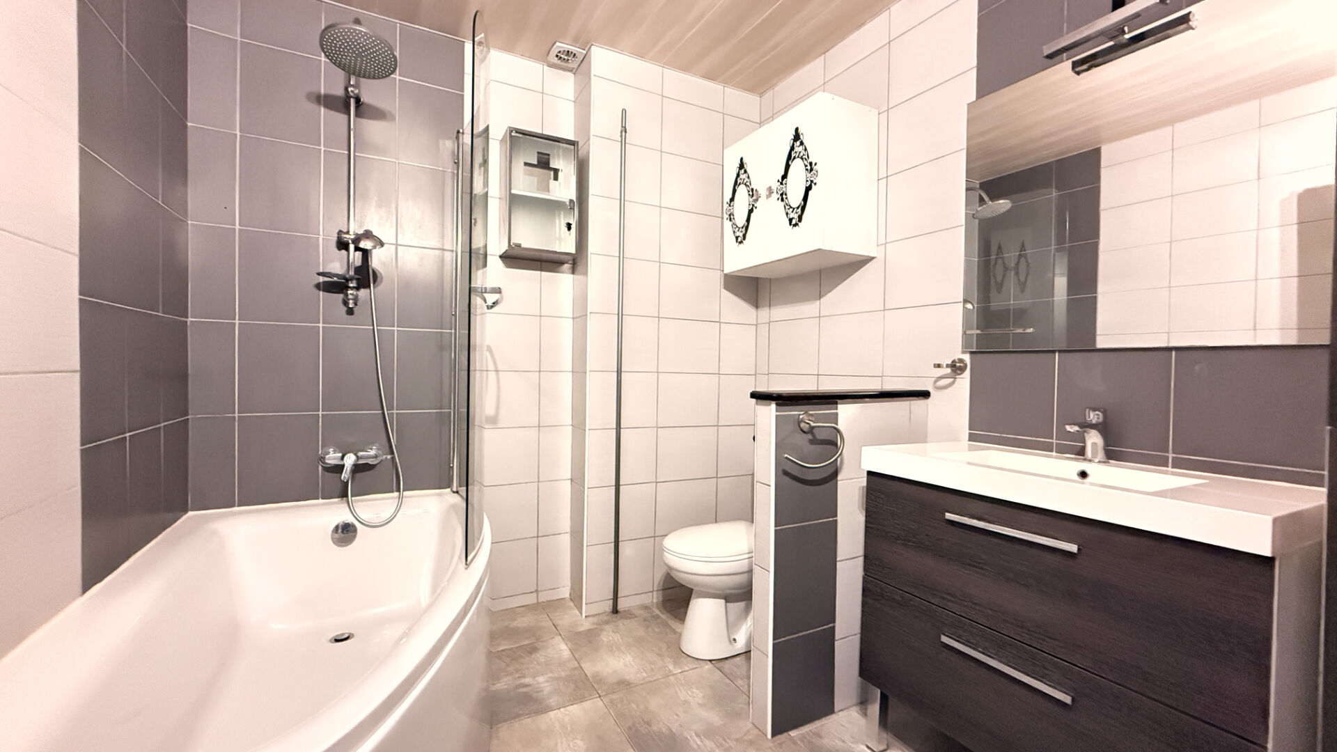 À l'étage, le coin nuit se compose d'un palier desservant quatre belles chambres. Vous y trouverez également une salle de bain équipée d'une baignoire et d'un WC, fonctionnelle et bien agencée.