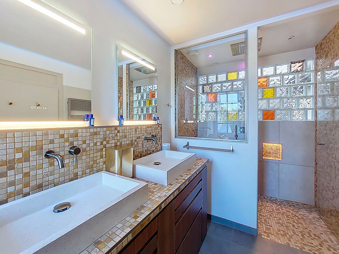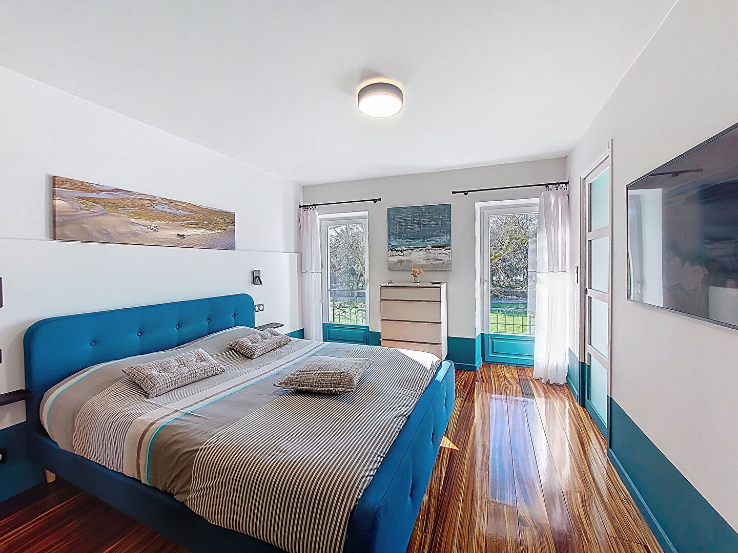 Pour monter à l'étage, nous prenons un bel escalier sous un puit de lumière pour arriver sur un palier menant aux 2 grandes chambres avec salle d'eau. L'une avec vue mer d'un côté et l'autre munie d'un dressing haut de gamme et de sa belle hauteur sous plafond avec vue sur le jardin. Une maison pleine de charme d'une rareté incomparable.