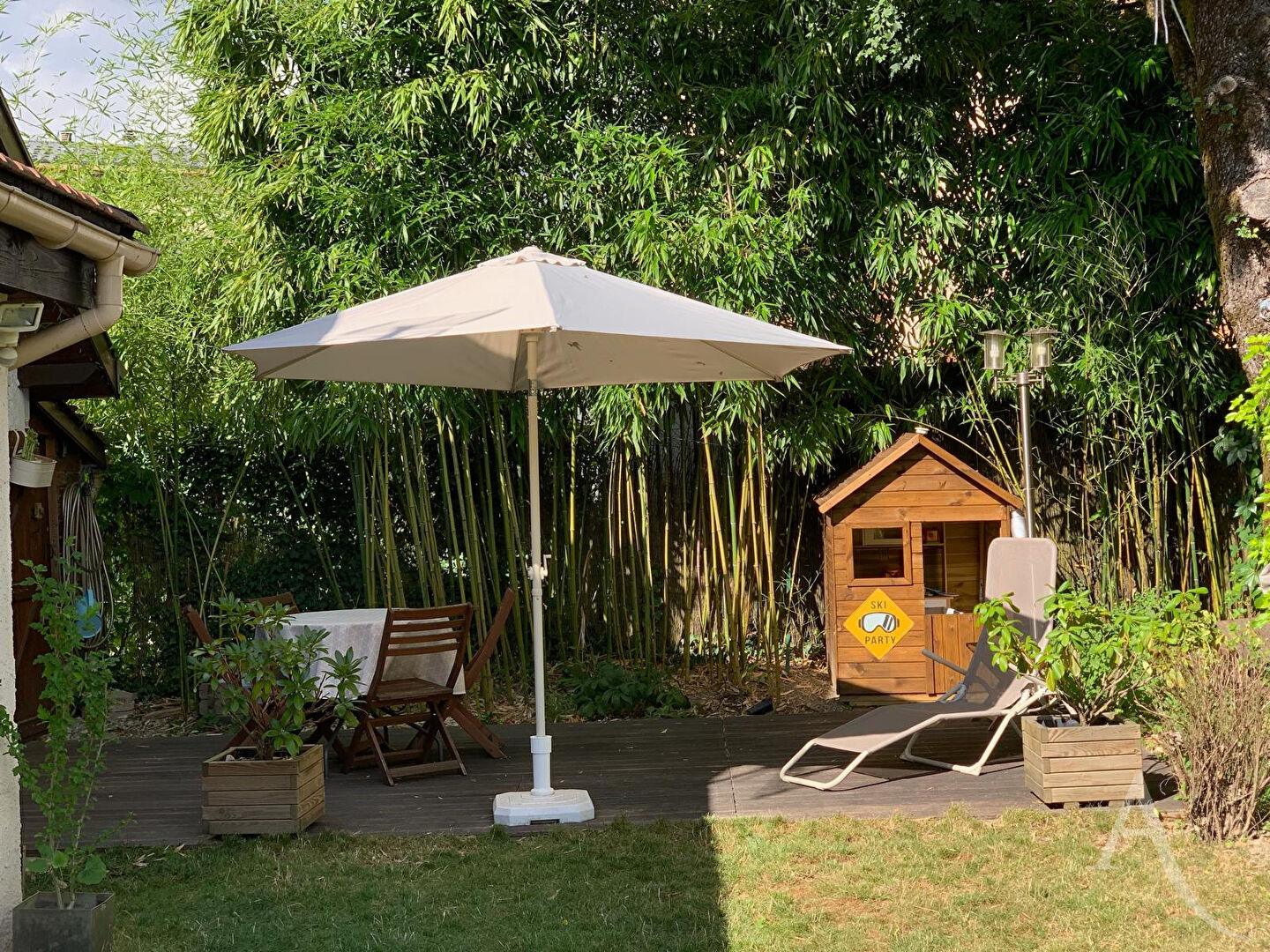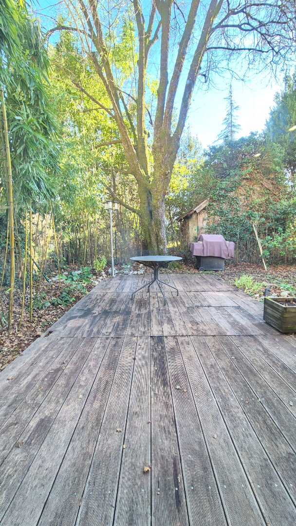 Bénéficiez d'un bel extérieur avec une terrasse en bois et de 2 places de parking et des cabanons de rangements.