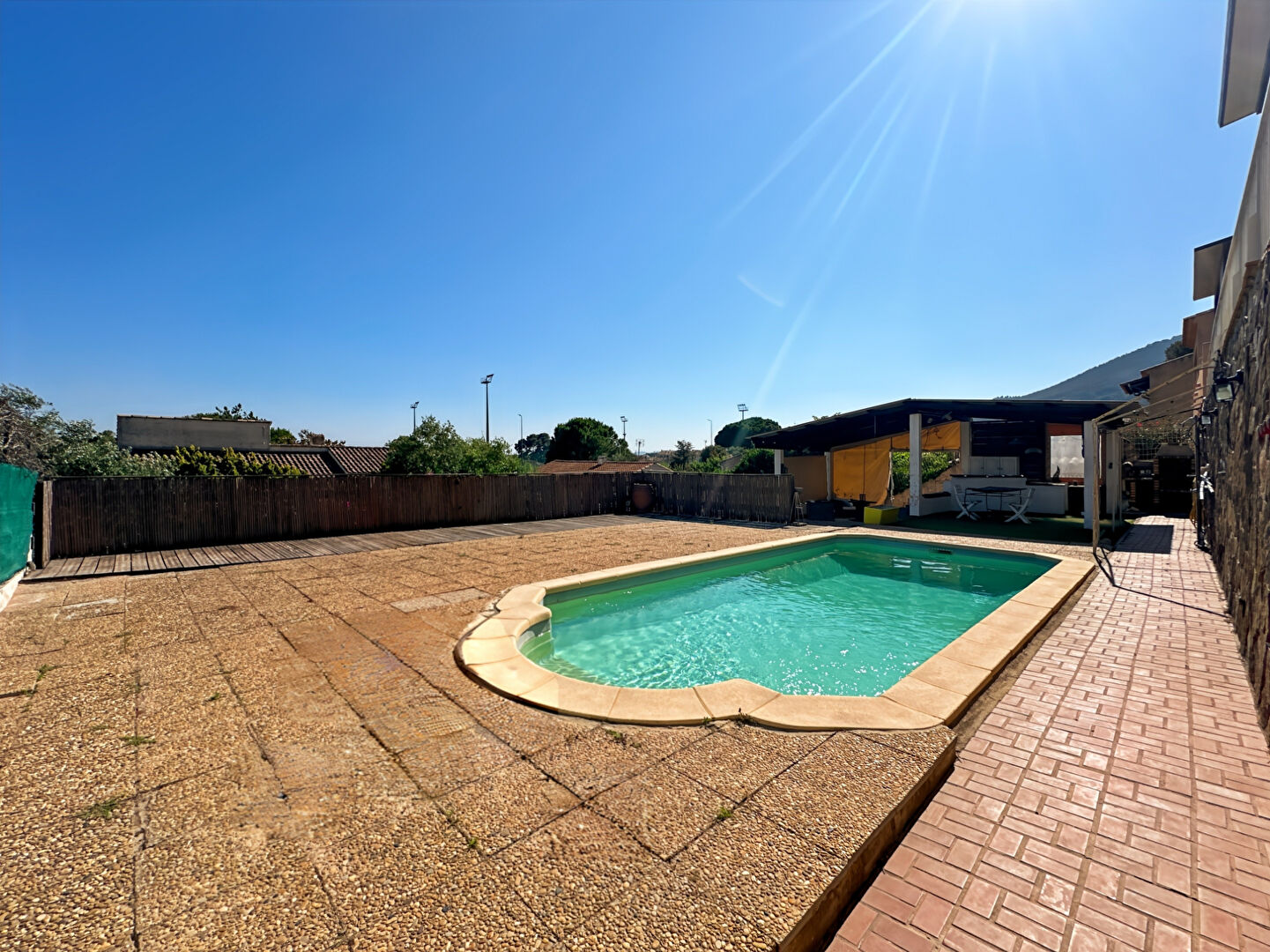 Terrain arboré avec piscine, plage d'été et pool house. Garage et abri à motos.
