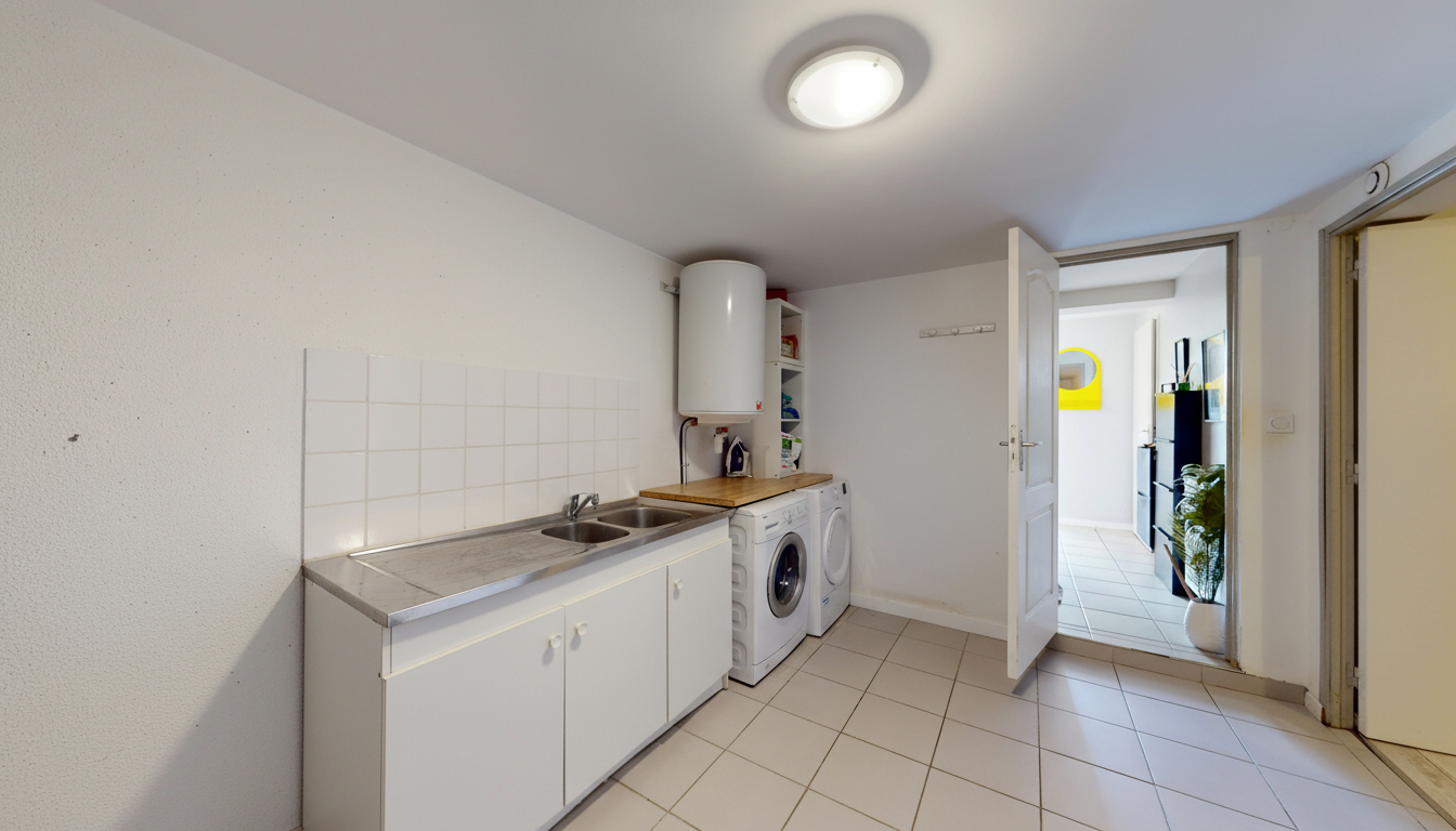 Au rez-de-chaussée, une entrée avec rangements, un garage, une buanderie aménagée avec point d'eau et douche, ainsi qu'une chambre ou un bureau pouvant servir de pièce d'appoint.