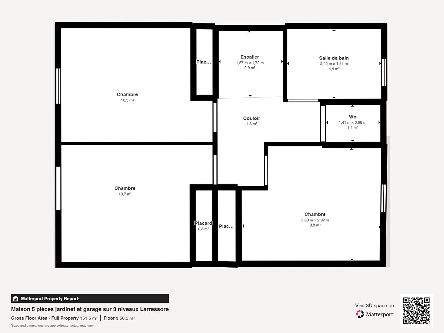 Édifiée sur une parcelle d'environ 140 m², cette maison développe 96 m² habitables sur deux niveaux supérieurs, pour une surface utile d'environ 128 m² incluant l'entrée, la buanderie et la chambre ou bureau du rez-de-chaussée, et 144 m² au total avec le garage, le tout bien agencé sur trois niveaux.