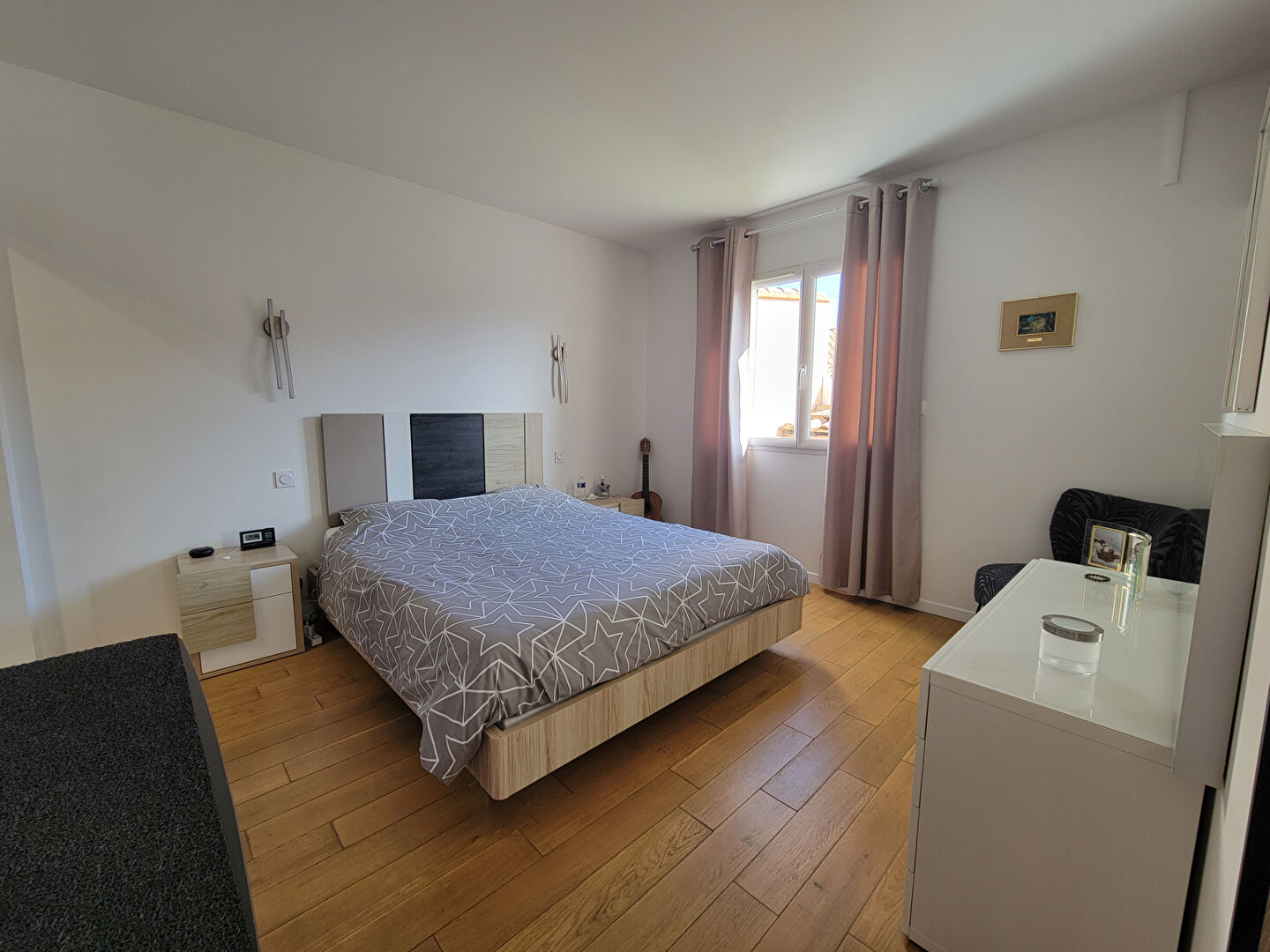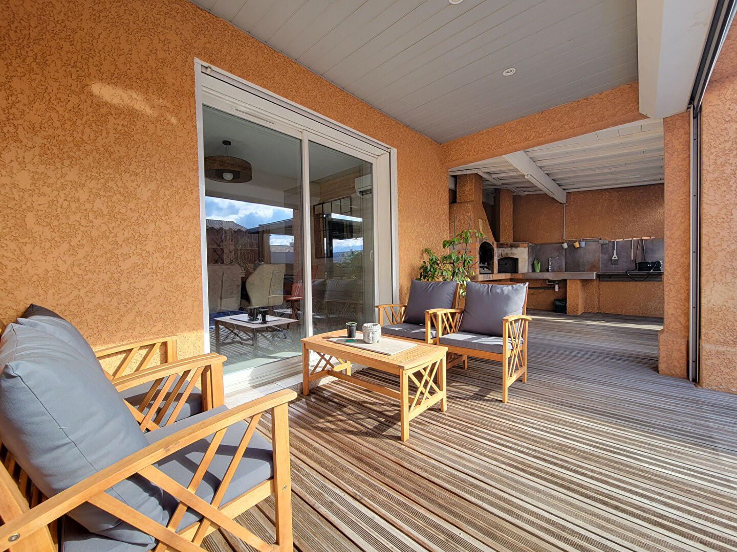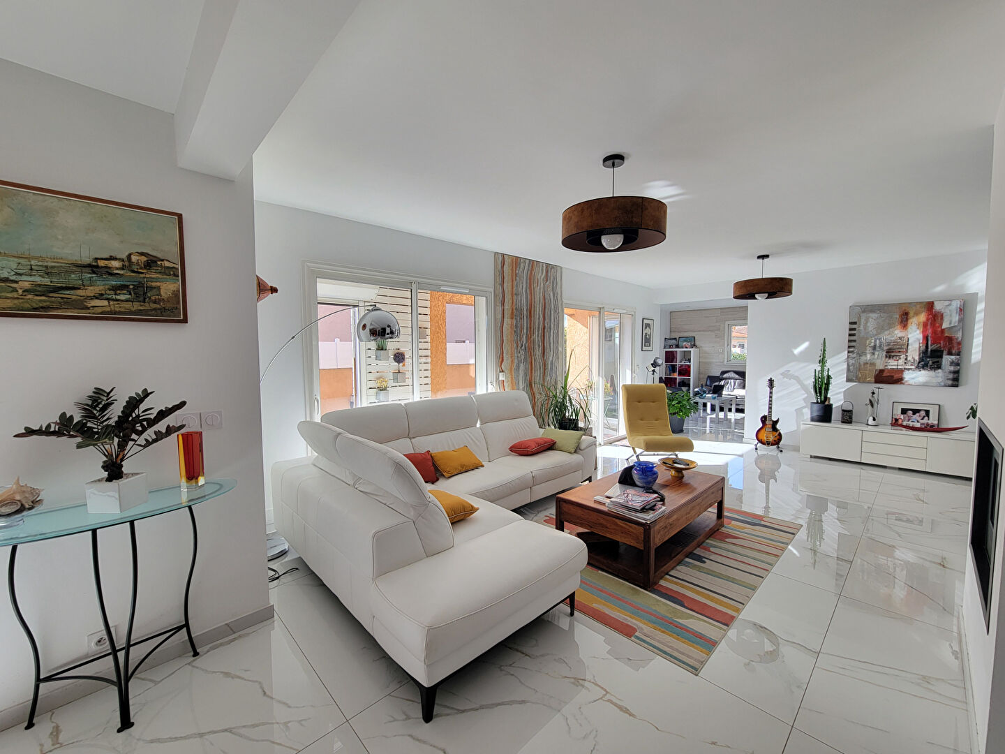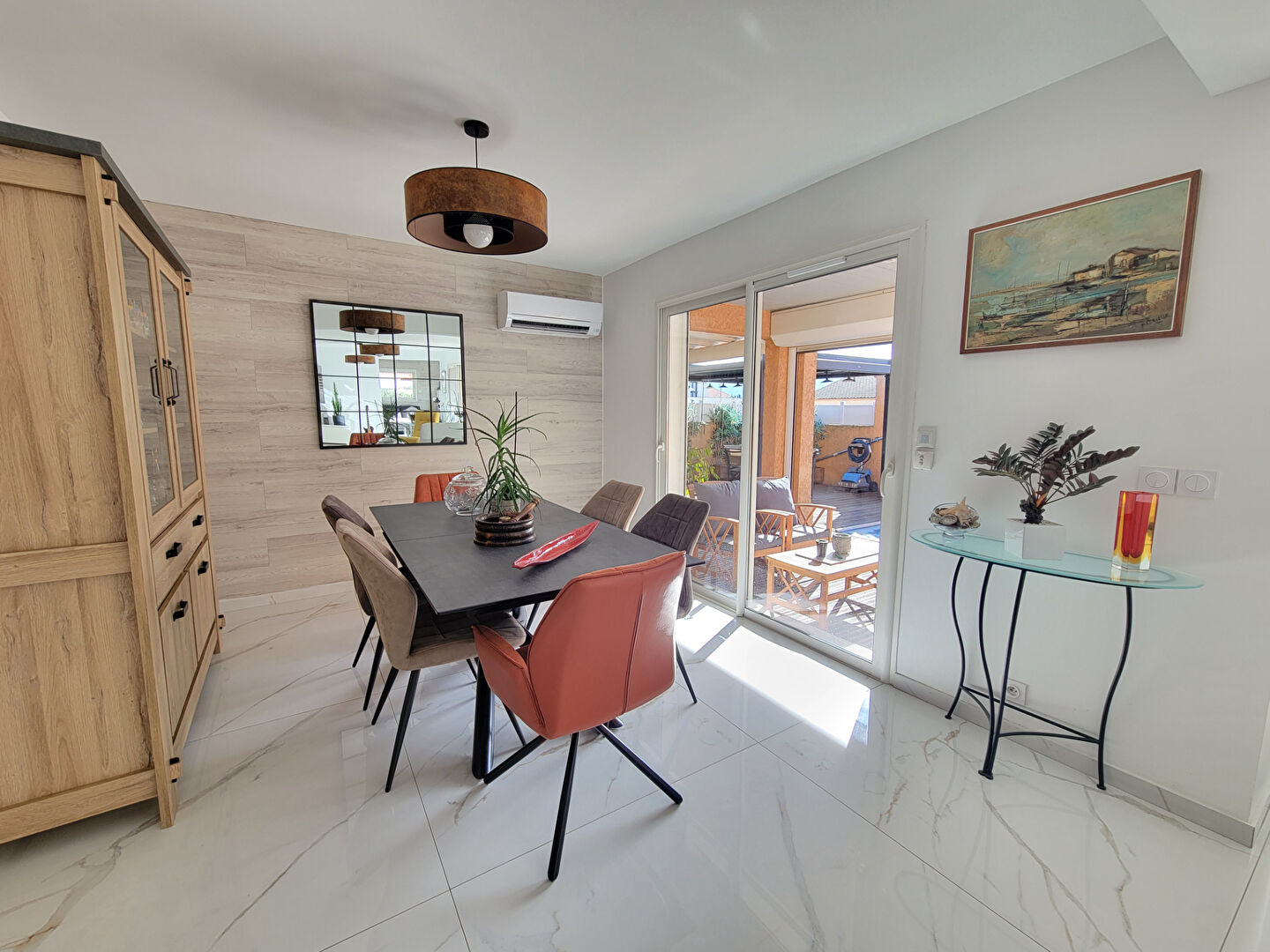 Côté équipements, la maison offre des prestations de qualité : climatisation réversible, poêle à granulés, aspiration centralisée, volets roulants électriques et double vitrage, le tout dans un état irréprochable.