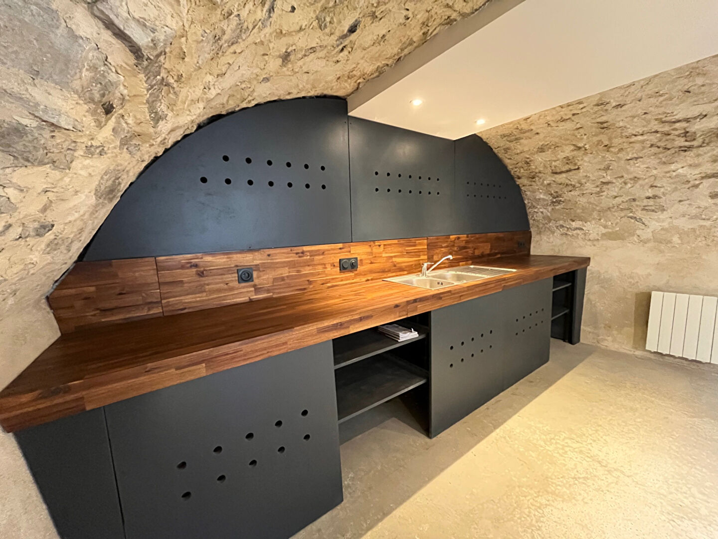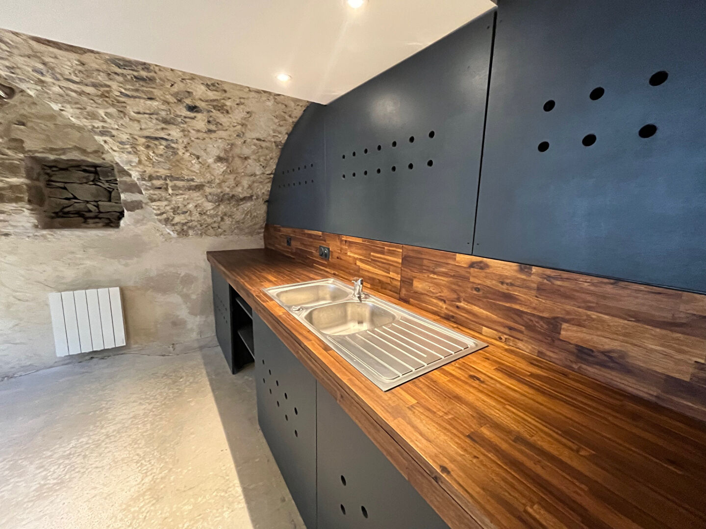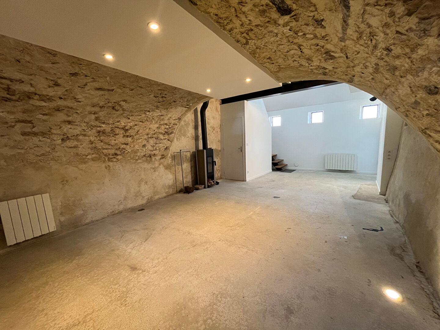 Derrière sa façade discrète, ce vaste espace vous accueille avec une magnifique voûte en rez-de-chaussée, un coin cuisine convivial, un espace de réception chaleureux agrémenté d'un poêle à bois, et un WC indépendant.