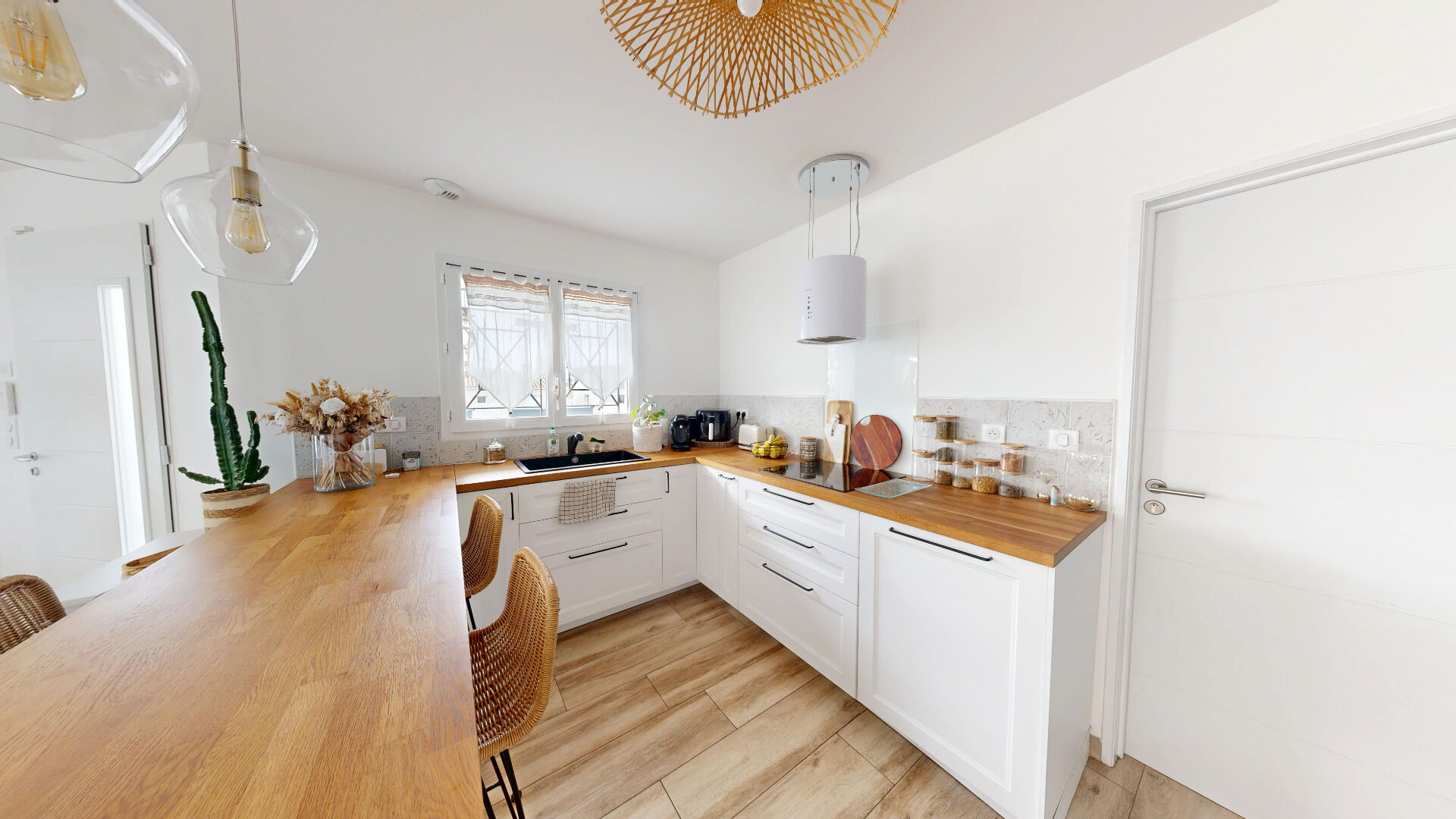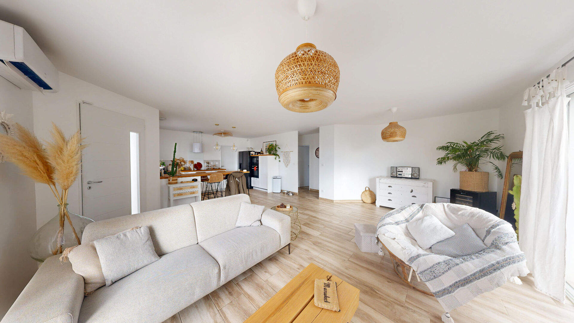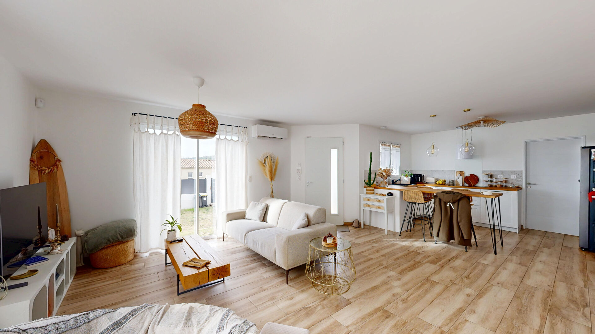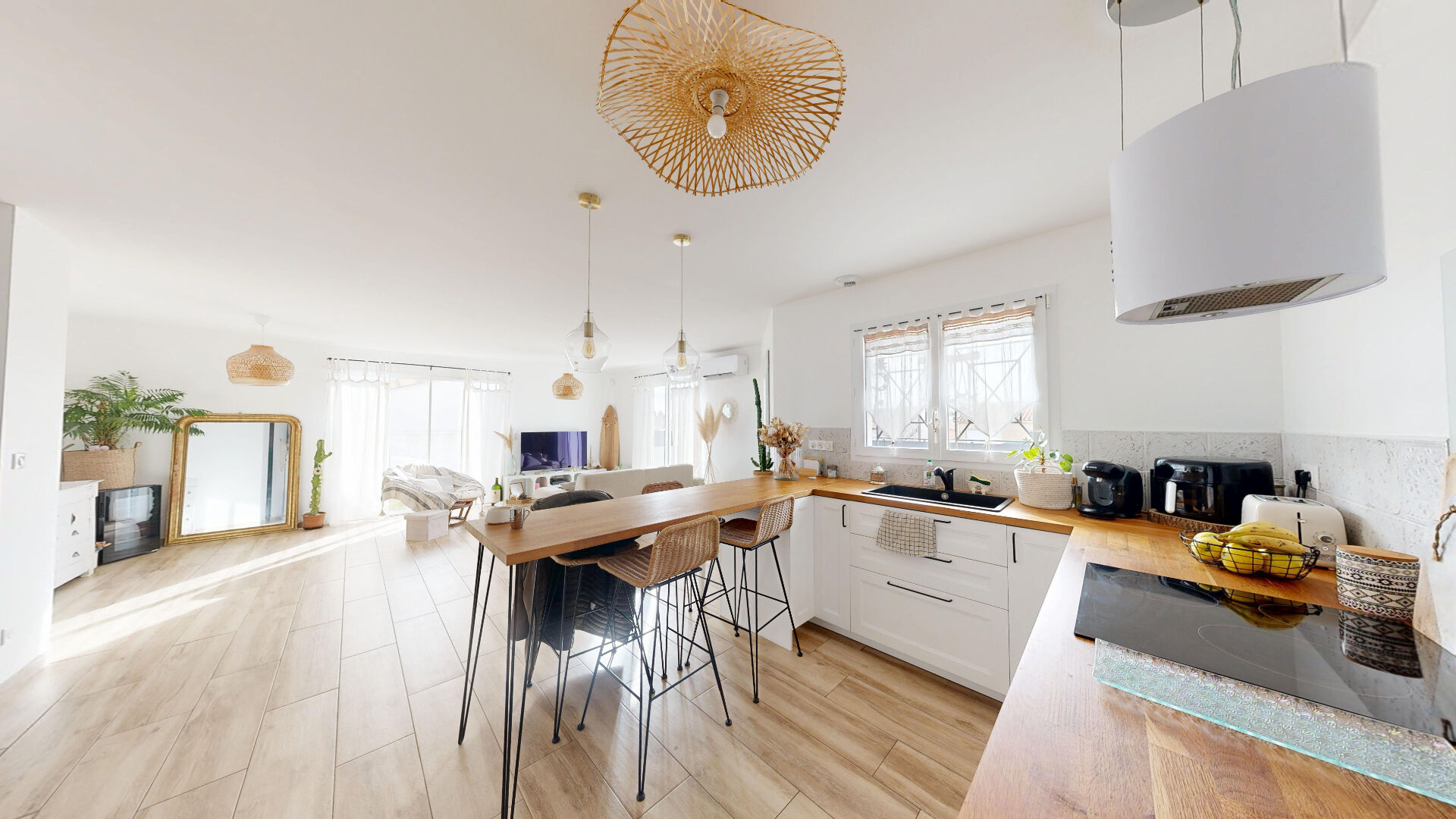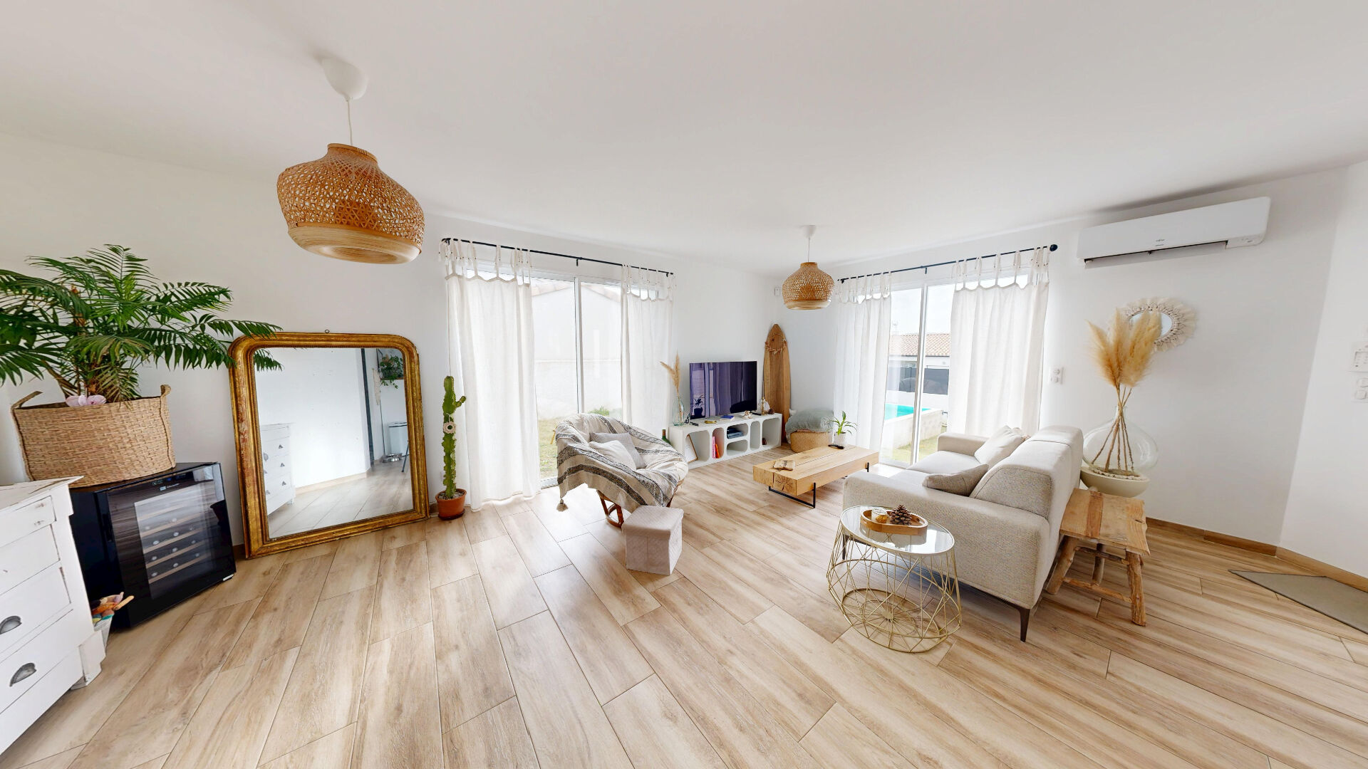 Dès l'entrée, vous serez séduit par une grande pièce de vie traversante où la lumière naturelle s'invite généreusement grâce à de larges baies vitrées donnant sur la terrasse et la piscine.