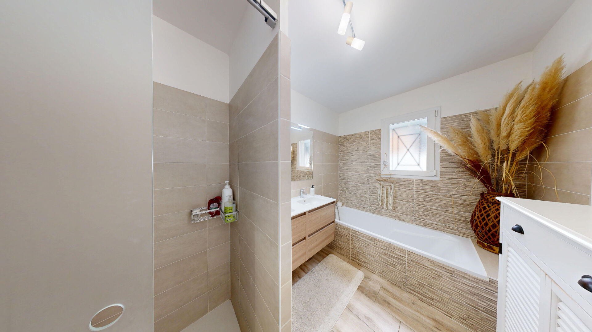 Une salle de bain élégante avec baignoire, meuble vasque design et espace prévu pour la machine à laver complète ce bel ensemble.