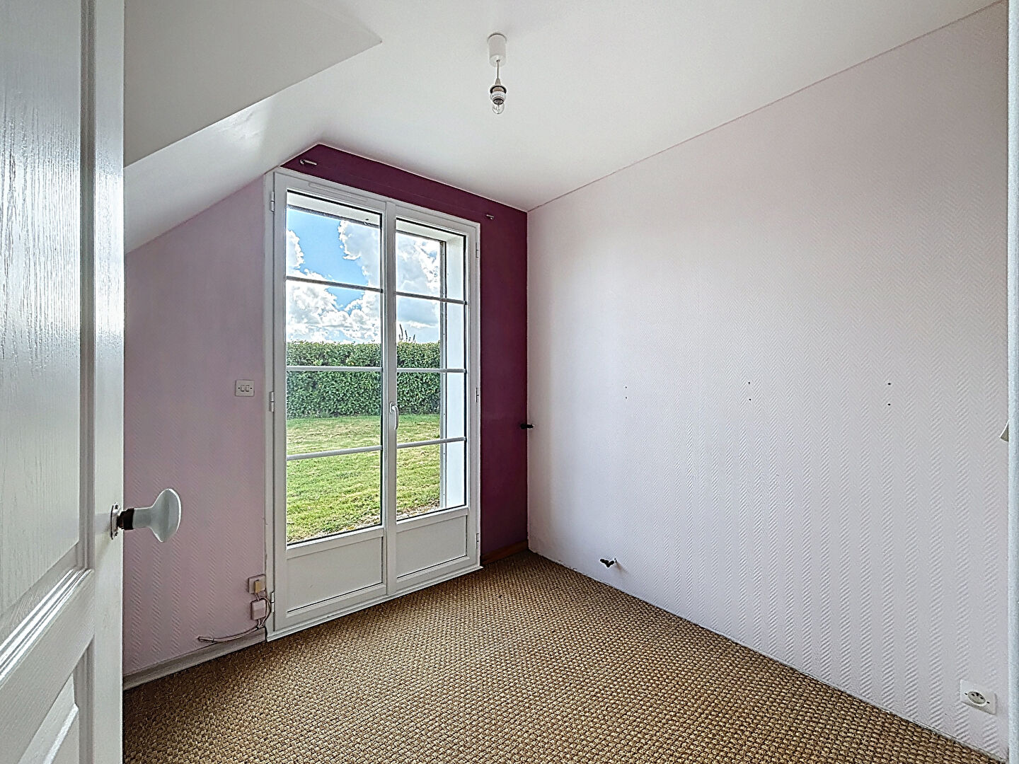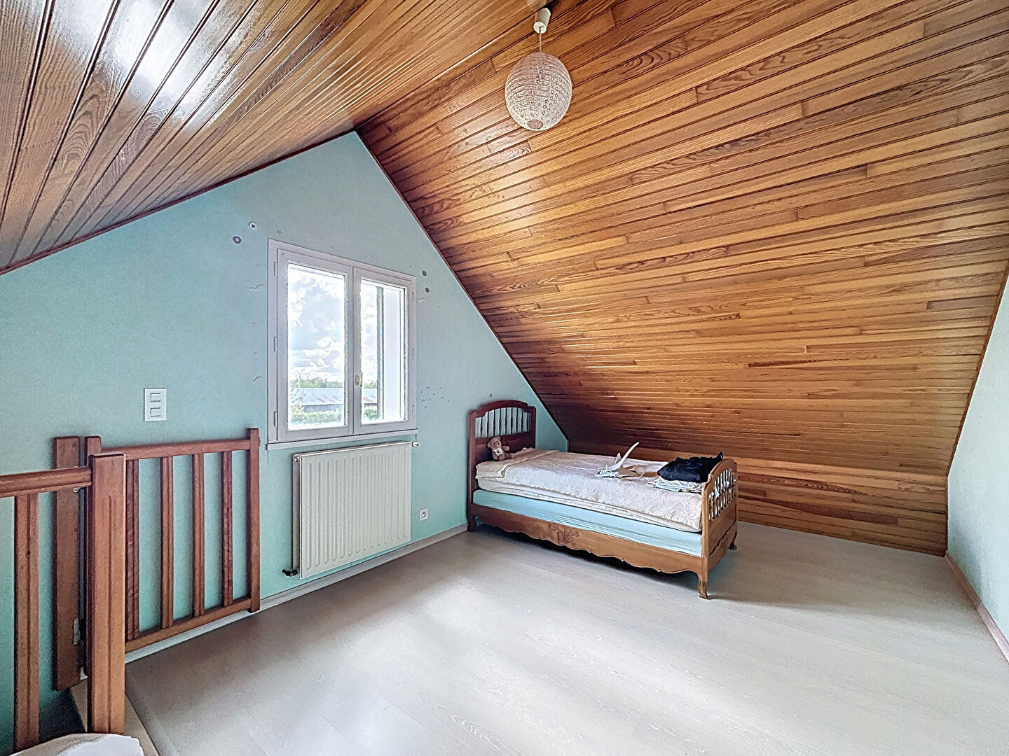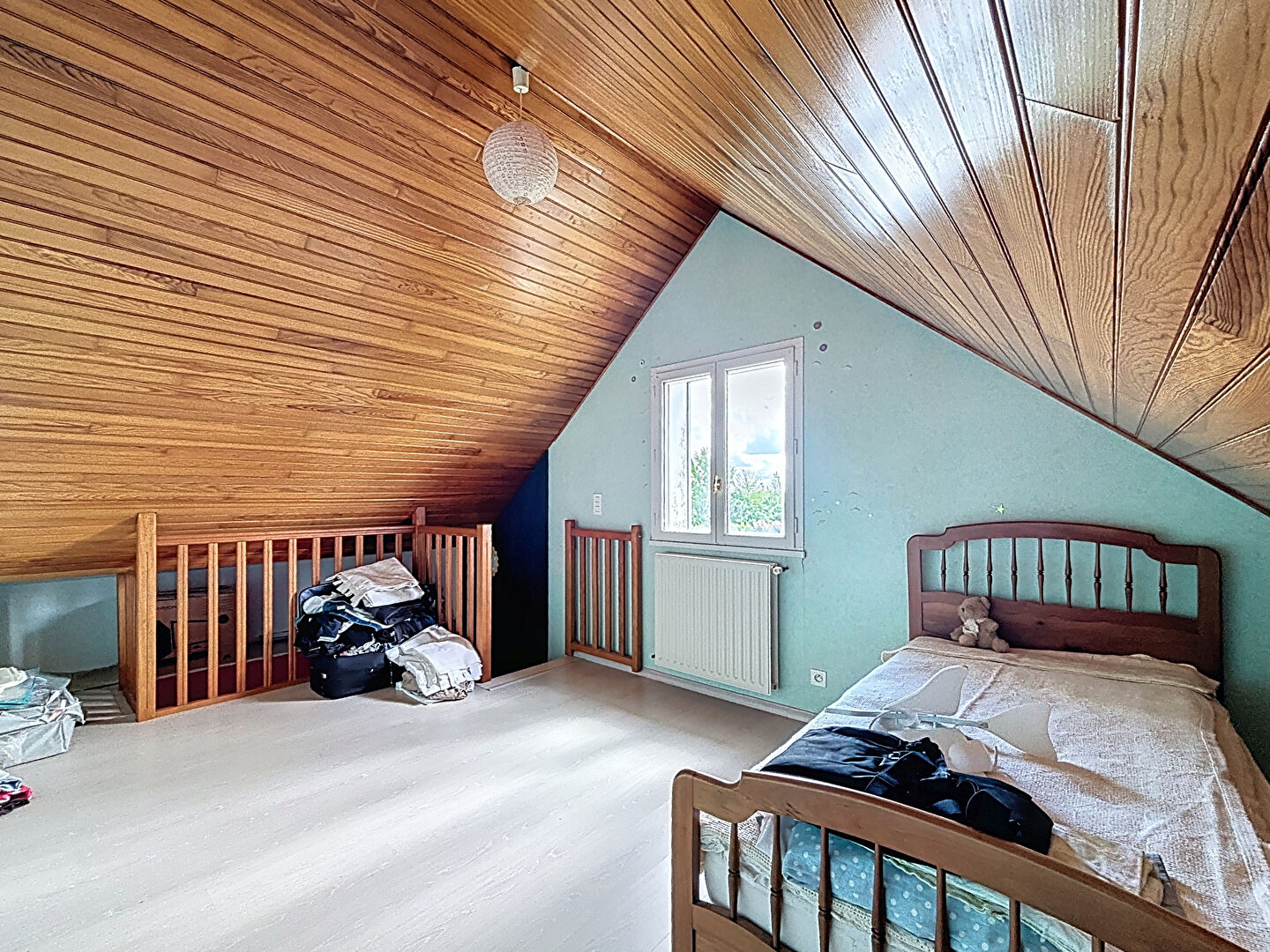 Puis à l'étage, sous mansarde, d'une chambre à rafraîchir.
